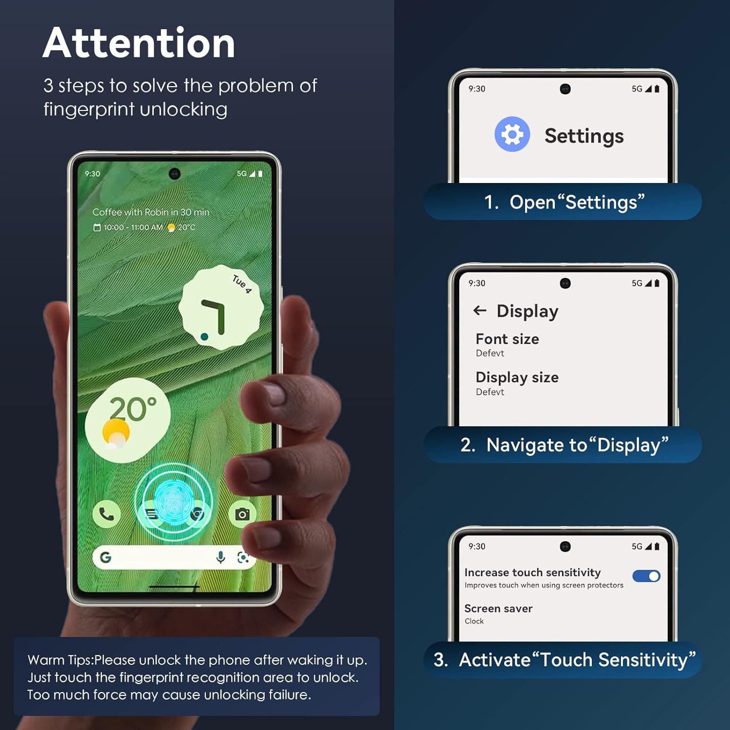 • 【2 Clear Screen Protectors】2 pack tempered glass screen protector (perfect support for ultrasonic fingerprint unlocking) made of HD clear scratch resistant bubble free anti-fingerprint tempered glass. Warm Tips. After installing the screen protector, follow the steps below to regain perfect fingerprint unlock: open "Settings" → open "Display" → open "Touch sensitivity" and finally re-record your fingerprint (2 times with the same finger from different angles).