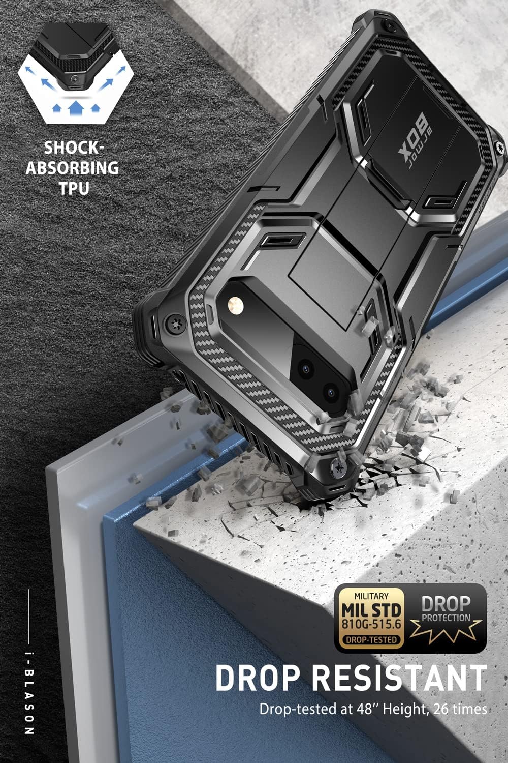 • Flexible TPU and polycarbonate materials provide 360°, certified military protection from drops or falls.(Certified MIL-STD 810G-516.6)