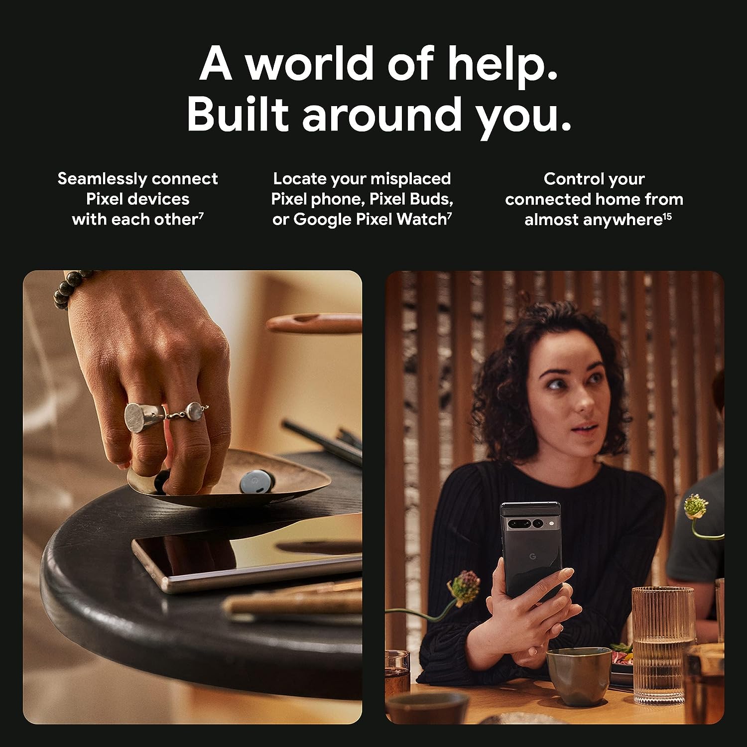 Meet Pixel 7 Pro, Google’s best-of-everything phone. Powered by Google Tensor G2, it’s fast and secure, with an immersive display and amazing battery life. It features the best Pixel camera yet, with a telephoto lens and pro-level features like Macro Focus, Cinematic Blur, and more. Plus, it’s Pixel’s most refined design, made with recycled materials.[20] LEGAL [1]Compared to Pixel 6. Speed and power efficiency claims based on internal testing on pre-production devices. [2]Works with all major carriers. 5G service is carrier dependent. Requires a 5G data plan (sold separately). 5G service not available on all carrier networks or in all areas. Contact carrier for details. 5G service, speed, and performance depend on many factors, including carrier network capabilities and signal strength. Actual results may vary. Some features not available in all areas. Data rates may apply. See g.co/pixel/networkinfo for info. [3]For “over 24 hours”: Estimated battery life based on testing using a median Pixel user battery usage profile across a mix of talk, data, standby, and use of other features. Average battery life during testing was approximately 31 hours. Battery testing conducted on a major carrier network. For “Up to 72 hours”: Estimated battery life based on testing using a median Pixel user battery usage profile across a mix of talk, data, standby, and use of limited other features that are default in Extreme Battery Saver mode (which disables various features including 5G connectivity). Battery testing conducted on a major carrier network. For both claims: Battery testing conducted in California in mid 2022 on pre-production hardware and software using default settings, except that, for the “up to 72 hours” claim only, Extreme Battery Saver mode was enabled. Battery life depends upon many factors and usage of certain features will decrease battery life. Actual battery life may be lower. [4]Measured diagonally; dimension may vary by configuration and manufacturing process. Not available for all apps or content. [5]Not available for all camera apps or modes. [6]Coming soon. Restrictions apply. Some data is not transmitted through VPN. Not available in all countries. All other Google One membership benefits sold separately. Use of VPN may increase data costs depending on your plan. See g.co/pixel/vpn for details. [7]Earbuds and watch sold separately. Requires Pixel Buds Pro connected with Fast Pair to a device with location history enabled. Requires Google Pixel Watch to be connected to a compatible device. [8]Designed to comply with dust and water protection rating IP68 under IEC standard 60529 when each device leaves the factory but the device is not water or dust proof. The accessories are not water or dust resistant. Water resistance and dust resistance are not permanent conditions and will diminish or be lost over time due to normal wear and tear, device repair, disassembly or damage. Dropping your device may result in loss of water/dust resistance. Liquid damage voids the warranty. See g.co/pixel/water for details. [9]Maximum resolution and field of view with RAW image files setting turned on. Setting is turned off by default. See g.co/pixel/photoediting for more information. [10]Some third party apps and data may not be transferred automatically. Visit g.co/pixel/copydatahelp for information. [11]Not available in all languages or countries. Not available on all media or apps. See g.co/pixel/livetranslate for more information. Translation may not be instantaneous. [12]Storage specifications refer to capacity before formatting. Actual formatted capacity will be less. [13]Magic Eraser requires Google Photos app and may not work on all image elements. [14]Unblurring may not work on all photos or videos with faces. [15]Requires compatible smart device. [16]The Google One and YouTube Premium 3-month trial offers are available to eligible users with the purchase of Pixel 7 Pro. Offer expires December 15, 2023 at 11:59 pm PT. Valid form of payment required at sign-up, but you will not be charged until the trial period expires. Cancel anytime. See youtube.com/premium/restrictions and one.google.com/offer/terms-and-conditions/pixel7and7pro for full terms. [17]Based on use of Smooth Display (not available for all apps or content). [18]See g.co/pixel/astrophotography for details. [19]Watch and earbuds sold separately. [20]Recycled materials are approximately 19% of phone based on weight. [21]Wireless charging rates up to 20W (Pixel 7) and up to 23W (Pixel 7 Pro) charging with Google Pixel Stand (2nd gen). Up to 12W with Qi-certified EPP chargers. Actual results may be slower. Fast wired charging rates (up to 18W on Pixel 6a, up to 20W on Pixel 7 and up to 23W on Pixel 7 Pro) are based upon use of the Google 30W USB-C® Charger or Google 18W USB-C® (Pixel 6a only) plugged into a wall outlet. Actual results may be slower. Chargers and Pixel Stand sold separately. [22]Measured diagonally; dimension may vary by configuration and manufacturing process [23]Requires compatible USB-C® device (sold separately). Charging speed varies and depends on device capabilities, battery age, usage during charging, and many other factors. [24]Estimated battery life based on testing using a median Pixel user battery usage profile across a mix of talk, data, standby, and use of other features. Average battery life during testing was approximately 29 hours. Battery life depends upon many factors and usage of certain features will decrease battery life. Battery testing conducted in California in early 2022 on pre-production hardware and software, using default settings. Battery testing conducted using Sub-6 GHz non-standalone 5G (ENDC) connectivity. Actual battery life may be lower.
