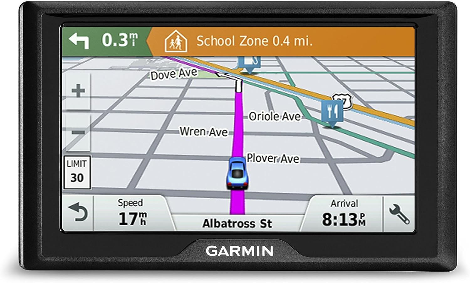 Garmin Drive 50 GPS navigator provides driver alerts to encourage safer driving and increase situational awareness. Warnings include alerts for sharp curves, speed changes, railroad crossings and animal crossings. Additionally, Garmin Drive 50 notifies you when driving the wrong way on a one-way street and sends warnings for nearby school zones. Receive alerts for nearby red light and speed cameras. For longer drives, a fatigue warning suggests break times and potential rest areas after hours of driving. The Up Ahead feature lets you easily see places up ahead and milestones along your route, without leaving the map view.