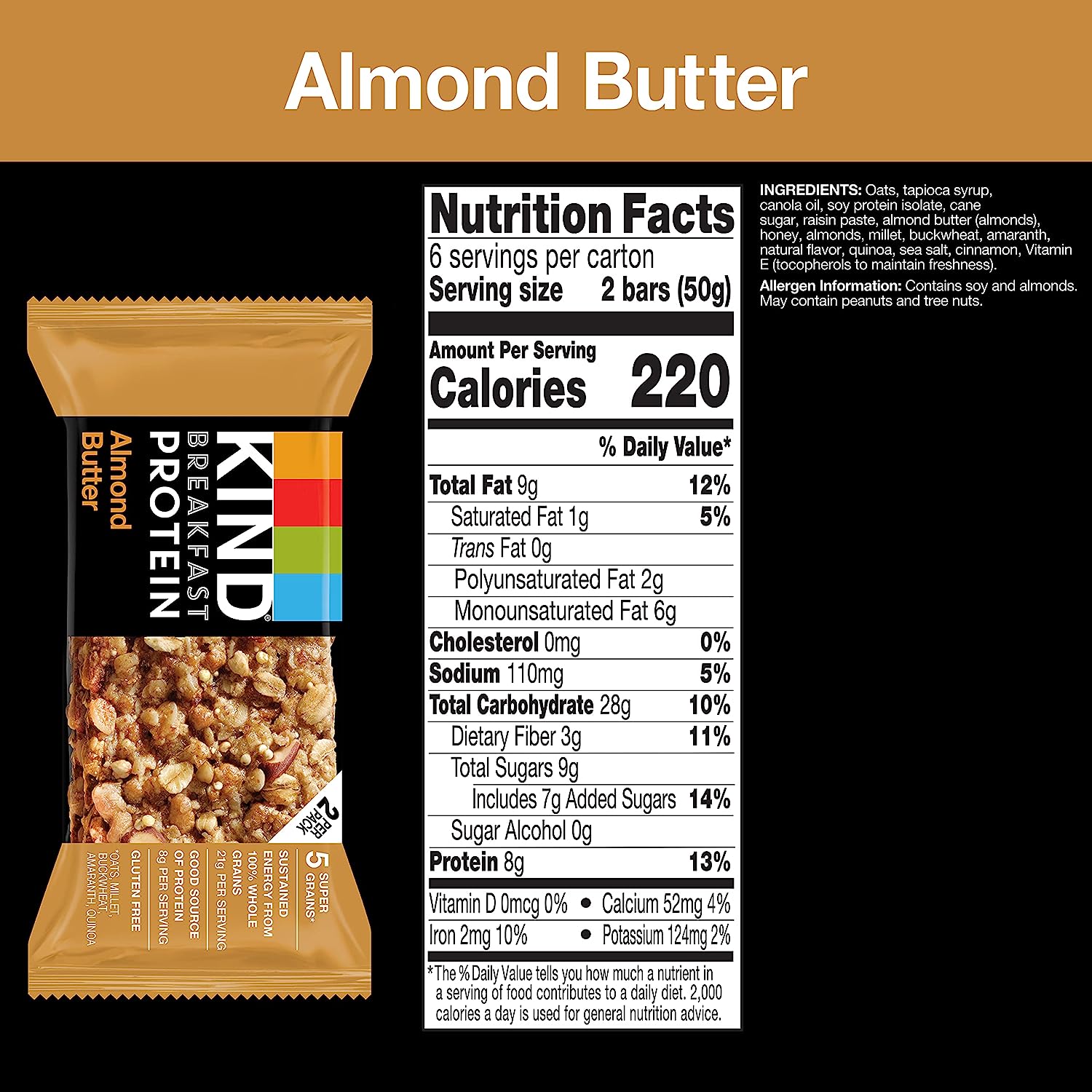 KIND Breakfast Almond Butter protein bars are a wholesome, healthy snack made with 100% whole grains for sustained energy. KIND Almond Butter breakfast protein bars are made with five super grains—oats, buckwheat, millet, amaranth and quinoa—and baked with almonds and a touch of honey for a chewy, soft baked addition to your breakfast. These KIND bars come in individually wrapped two bar packs that are perfect for convenient, on-the-go gluten free snacks. Each two bar pack has at least one full serving of whole grains. KIND Breakfast protein bars help provide sustained energy whether you need a nutritious snack for your lunchbox or nutrition bars to grab on your way out the door. Made with quality, wholesome ingredients, these gluten free breakfast bars contain 20 grams of whole grains per serving and 0 grams of trans fat. These healthy snacks are also dairy free and made without genetically engineered ingredients.