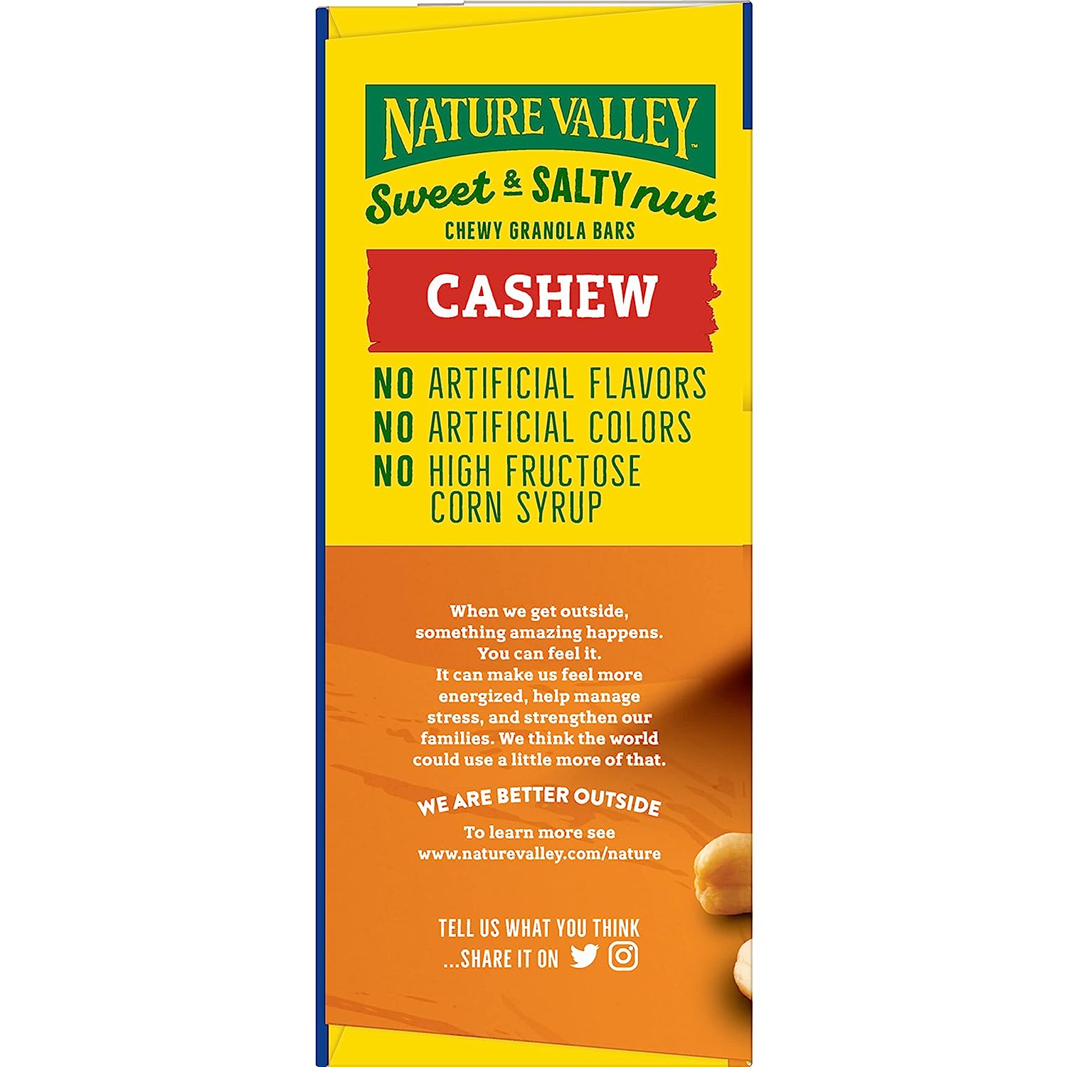 Sweet. Salty. Adventure-Ready. Nature Valley Cashew Sweet and Salty Nut Granola Bars are positively bursting with cashews and sweet granola. Our Sweet & Salty bar is a portable snack perfect for the pantry, lunch box, and hiking trail. This tasty snack bar provides a perfect balance of savory nuts and sweet granola. Stock up for a breakfast bar, an office snack or an on-the-go treat the whole family can enjoy. At Nature Valley, we believe that what you put in is what you get out. So when you need to be great out there, you can rely on us for real energy, wherever and whenever you need it. Energy you can depend on. Contains 12 bars in total.