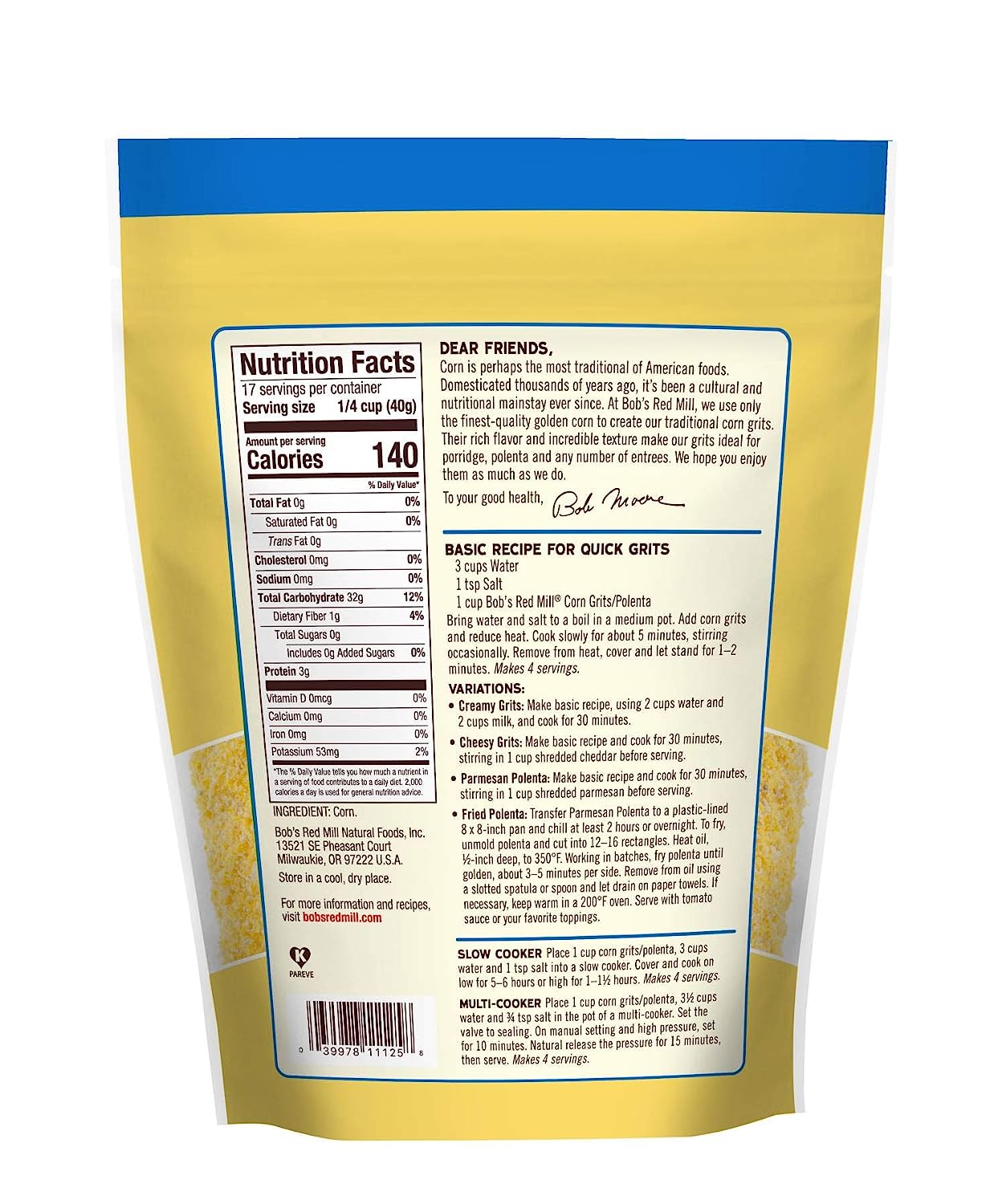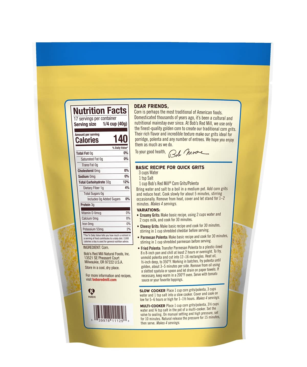Bob's Red Mil Corn Grits Polenta cooks quickly and makes a rich, creamy porridge for breakfast, lunch or dinner. These coarsely ground yellow corn grits can be made sweet or savory, and they’re also an essential ingredient for the classic Italian dish polenta.
