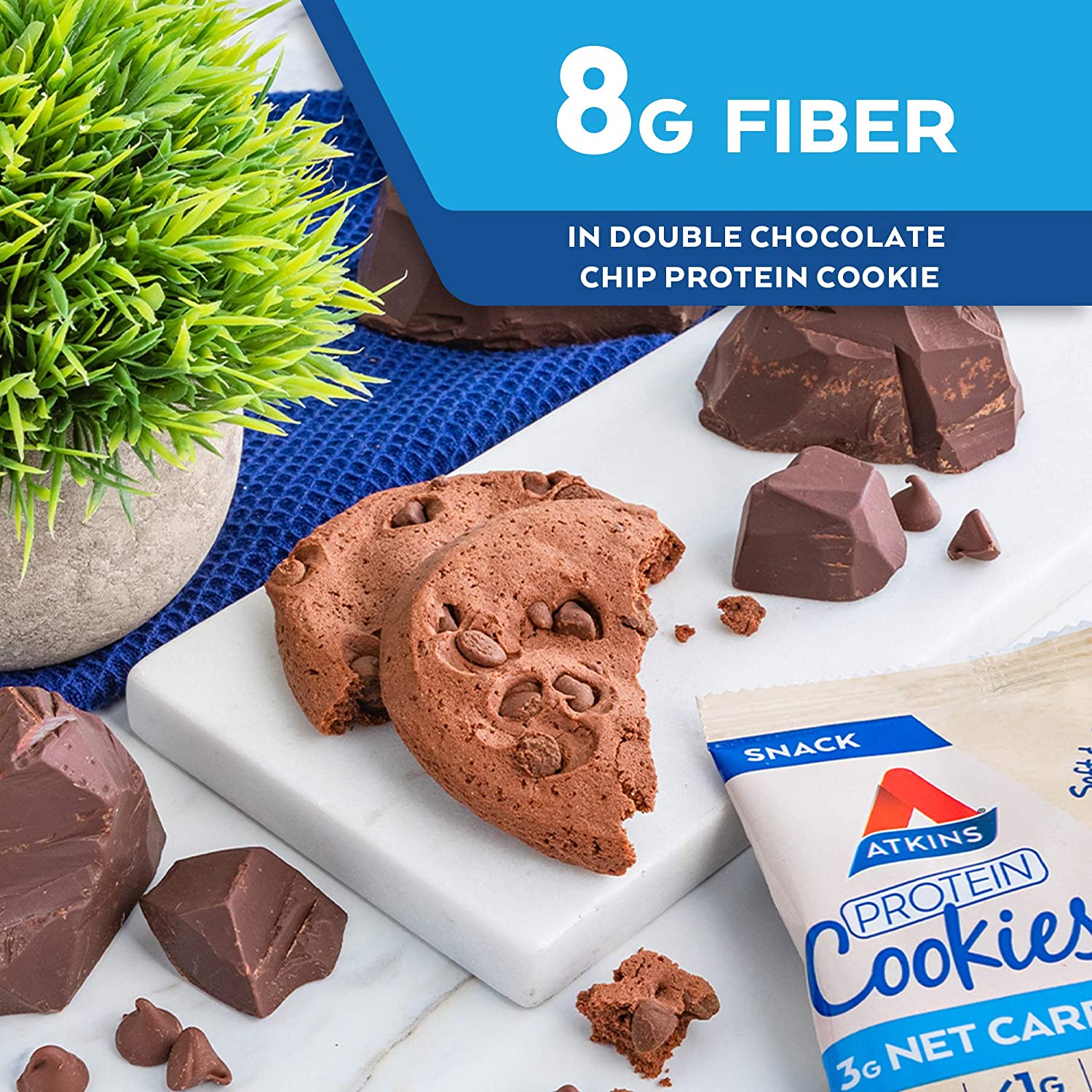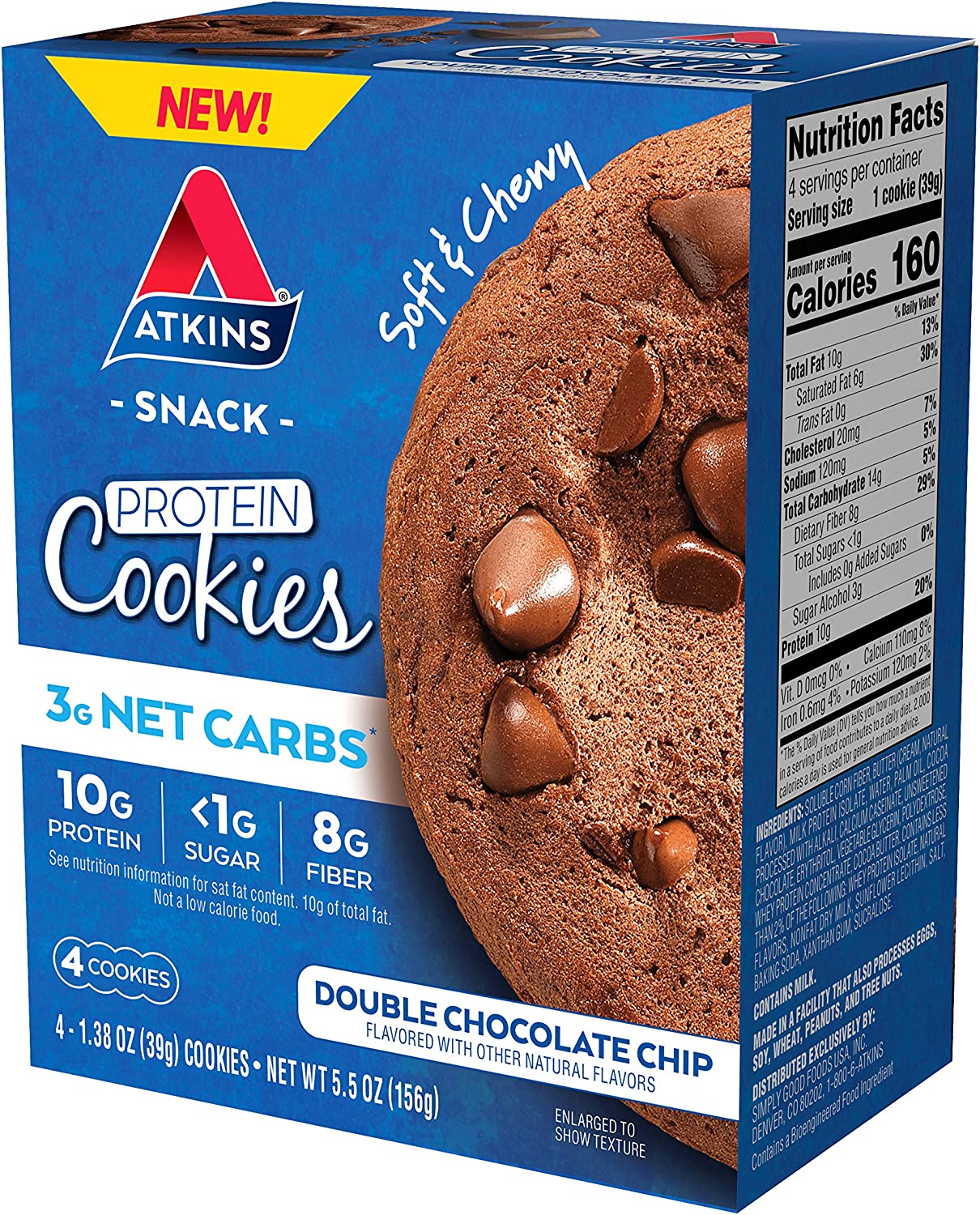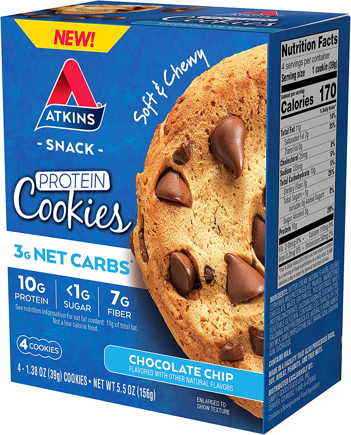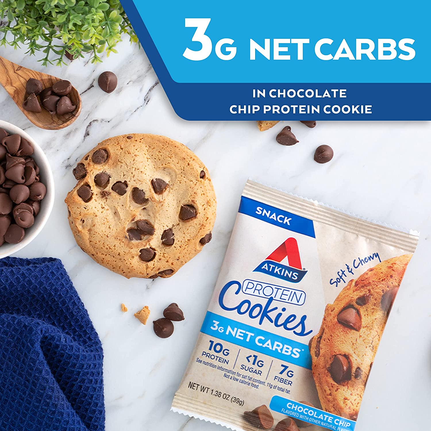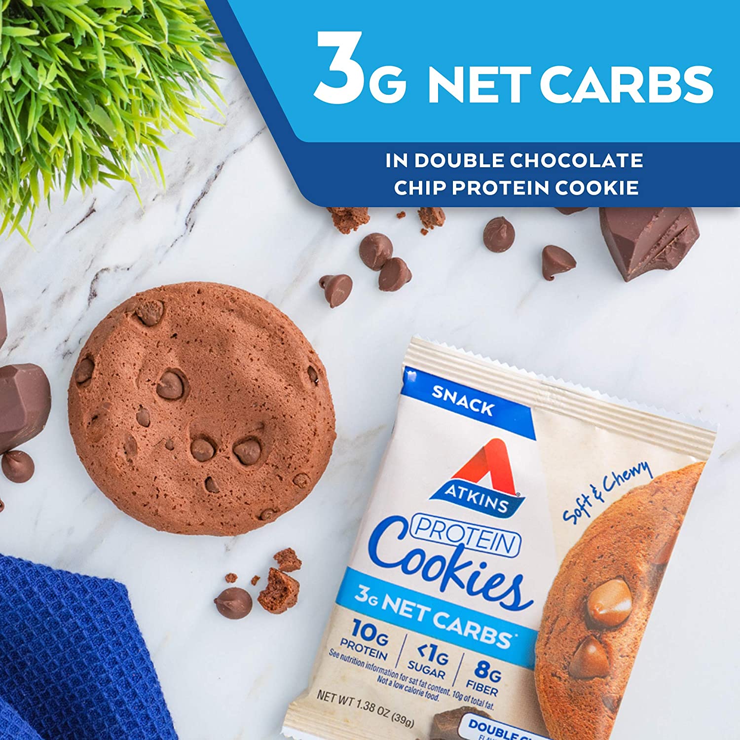 • STAY ON TRACK. Stay true to the Atkins Diet and Lifestyle with our delicious protein cookies. This protein Cookie has 3 grams of net Carbs and less than 1 gram of sugar per serving.