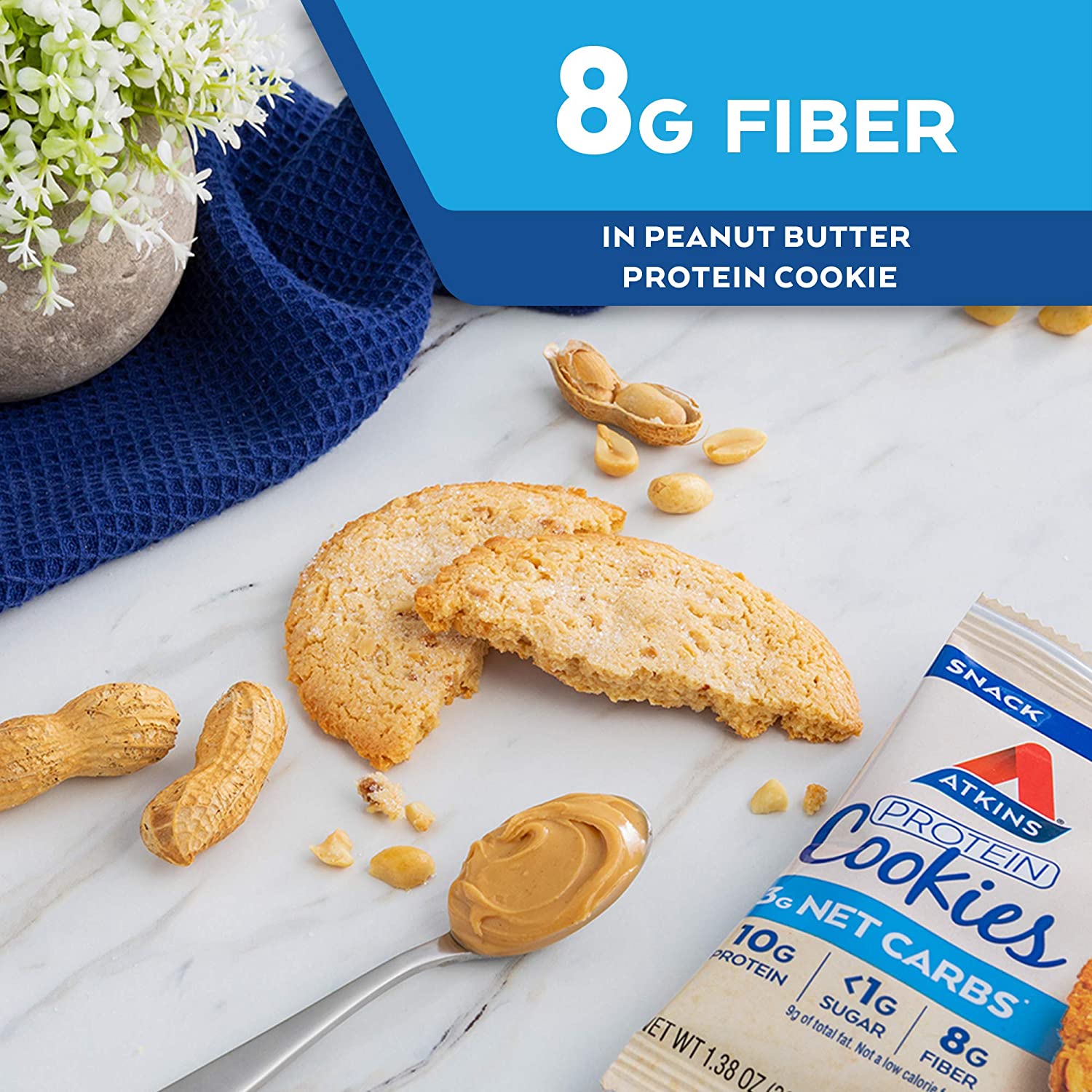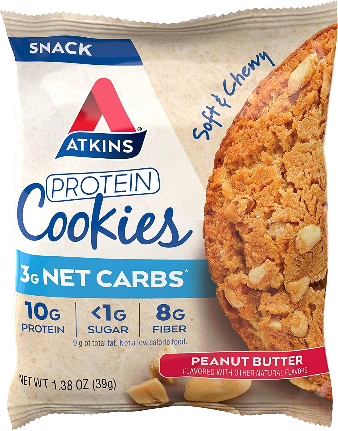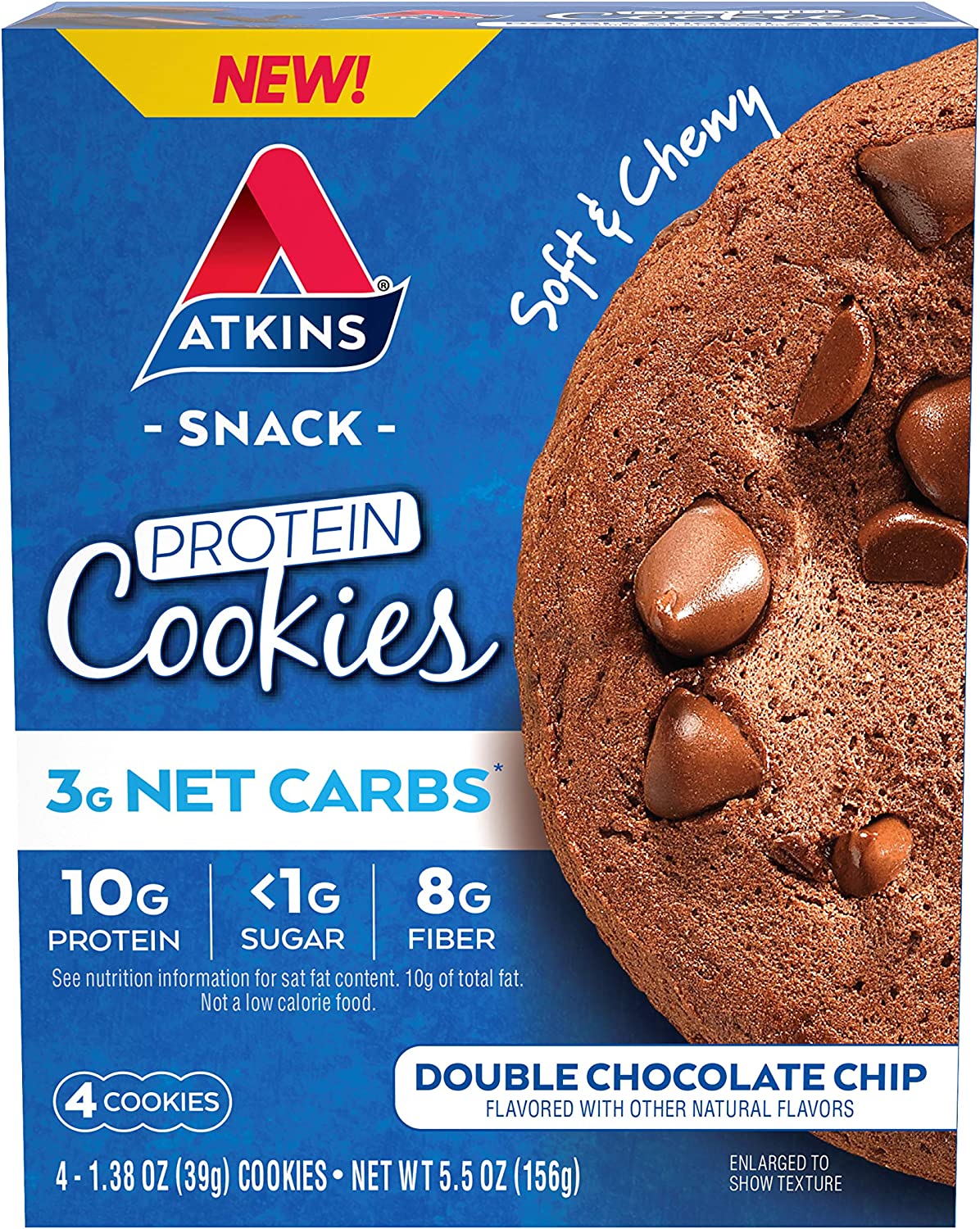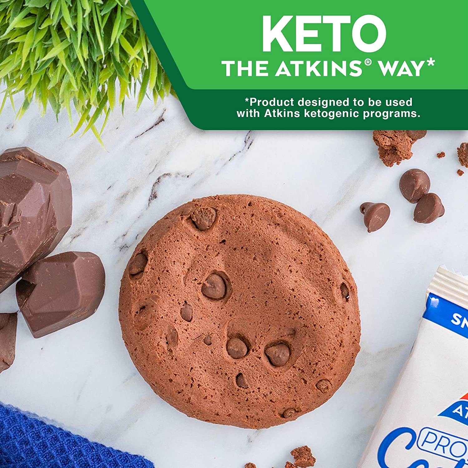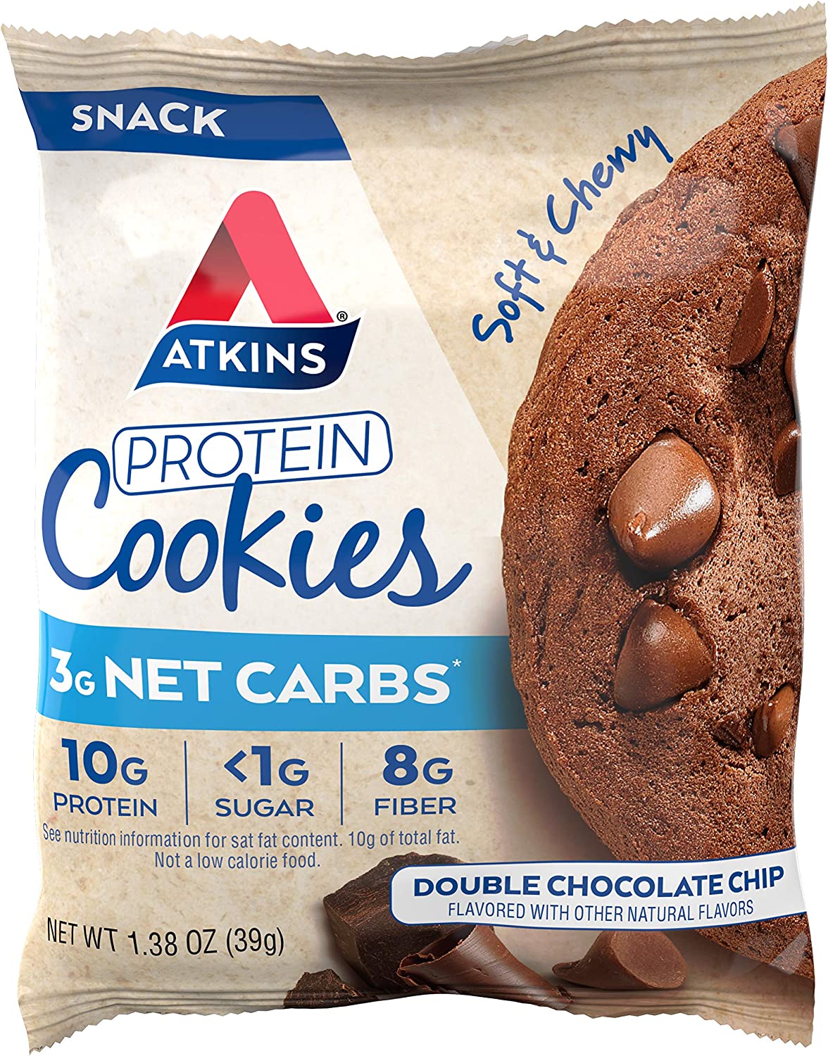 • STAY ON TRACK. Stay true to the Atkins Diet and Lifestyle with our delicious protein cookies. This protein Cookie has 3 grams of net Carbs and less than 1 gram of sugar per serving.