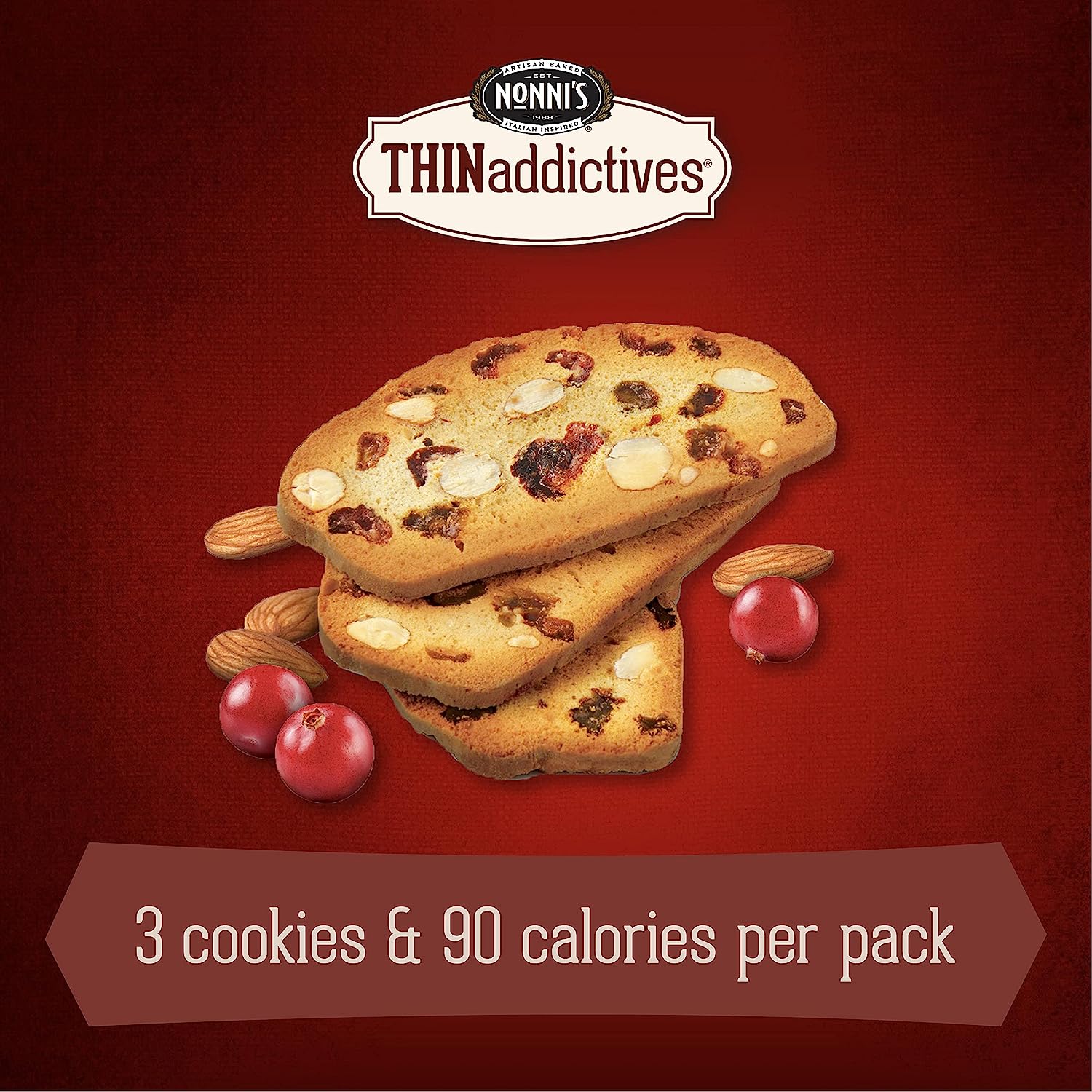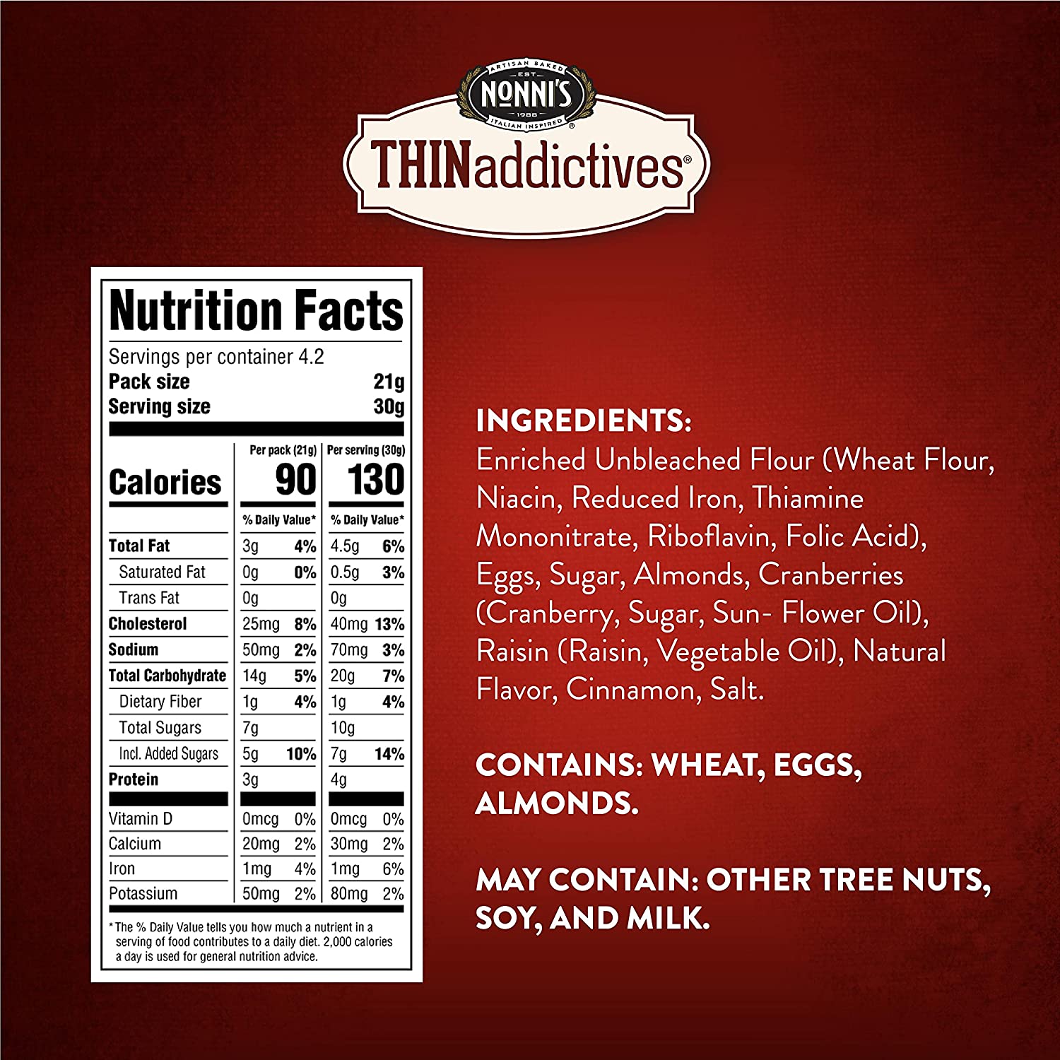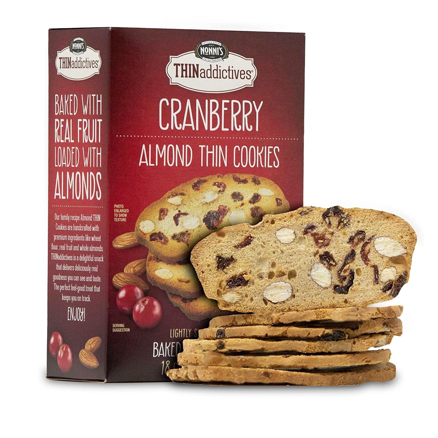 Product Highlights: Only 100 Calories Per Serving - Each cookie only has 100 calories! Enjoy this guilt-free snack anytime or anywhere. Light, Sweet & Crunchy - Packed with delicious cranberry and California almonds, you’ll be hooked after just one bite. Wholesome Ingredients - All Nonni's almond thin cookies are baked with the freshest, most wholesome ingredients without any artificial flavors. Individually Wrapped - Each cranberry almond thin cookie comes individually wrapped for freshness.
