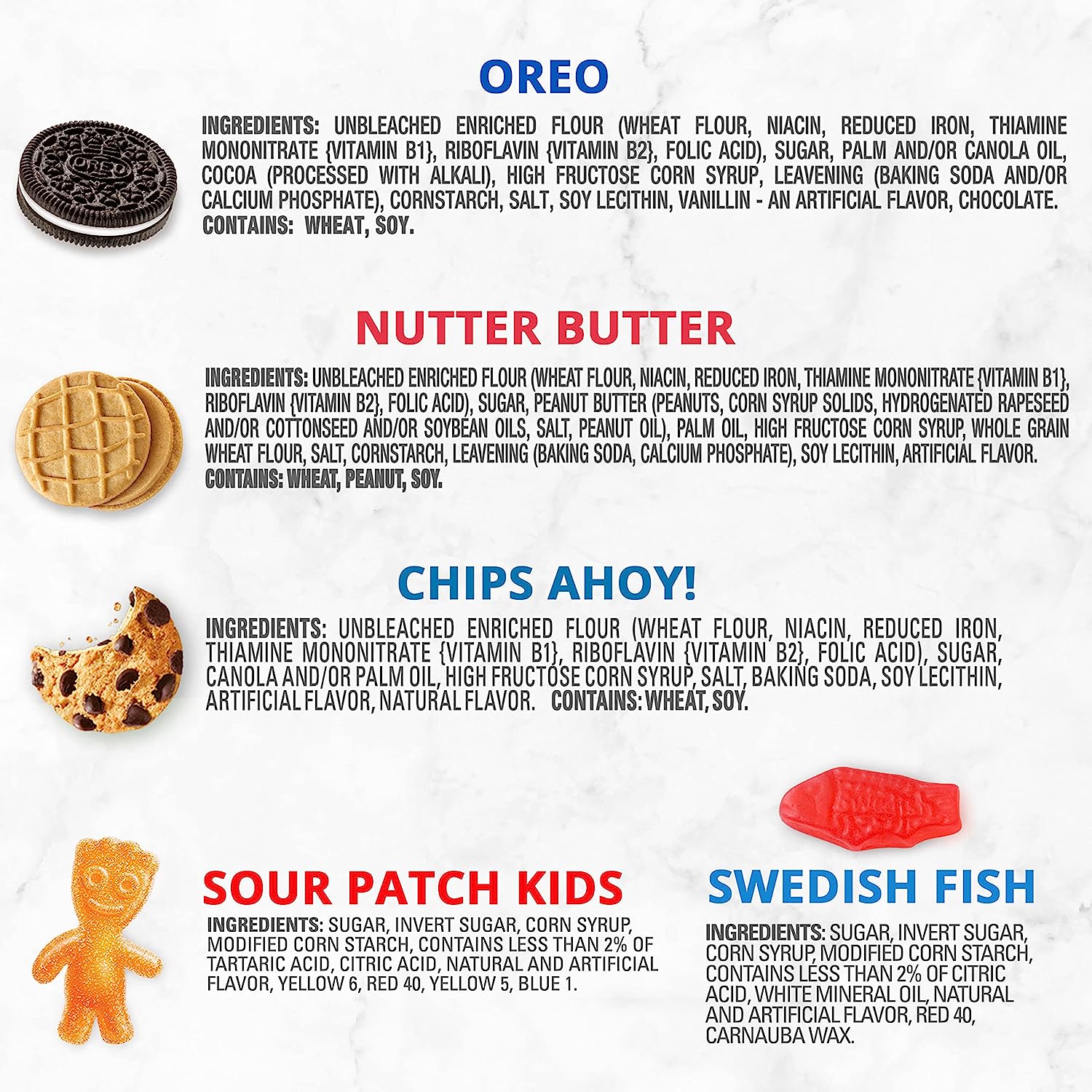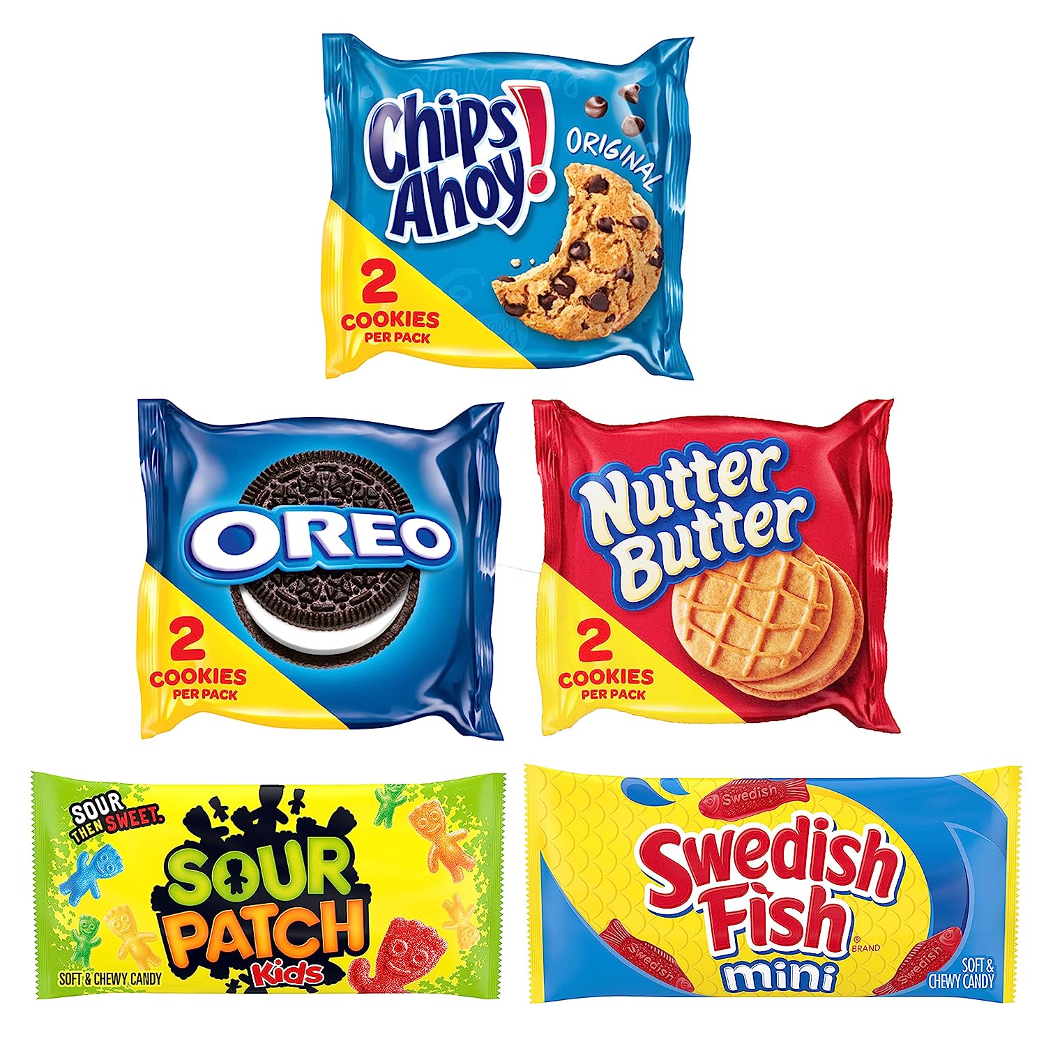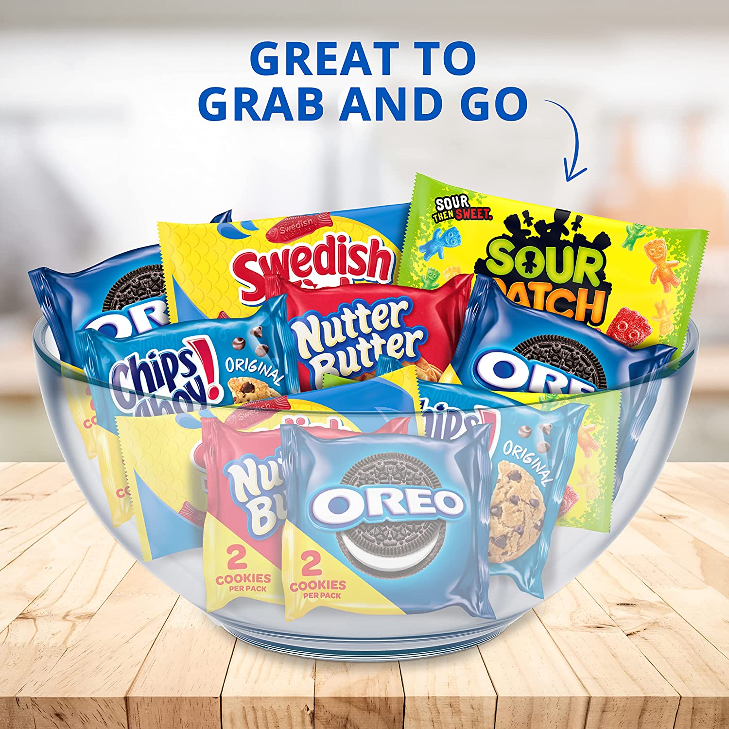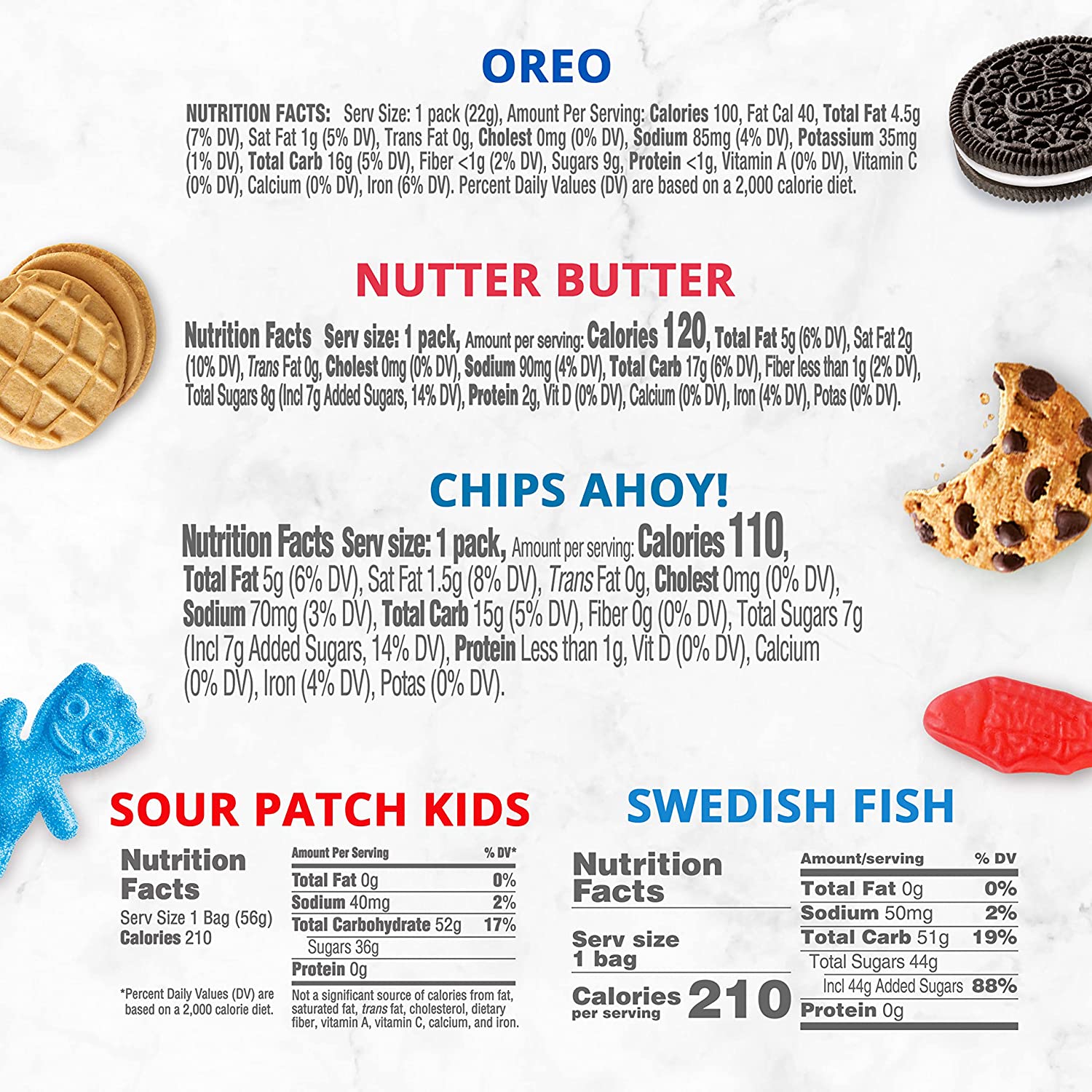 A variety of Nabisco cookies and chewy candies have come together in one pantry-perfect bundle! From OREO Chocolate Sandwich Cookies and CHIPS AHOY! Chocolate Chip Cookies to round Nutter Butter Peanut Butter Sandwich Cookies, SOUR PATCH KIDS Candy, and SWEDISH FISH candy, individually wrapped Nabisco treats are simple (and fun) snack solutions. Stock the snack shelf with treats the whole house, office, or class can enjoy. Individual snack-size packs make it easy to grab and go. They’re also convenient after-lunch snacks, office snacks, pantry snacks, holiday stocking stuffers, birthday party favors, Easter basket fillers, Halloween treats and more! This bulk snack package contains 10 packs each of two count OREO cookies, CHIPS AHOY! cookies, and Nutter Butter cookies and 5 packs each of SOUR PATCH KIDS candy and SWEDISH FISH candy (40 snack packs total).