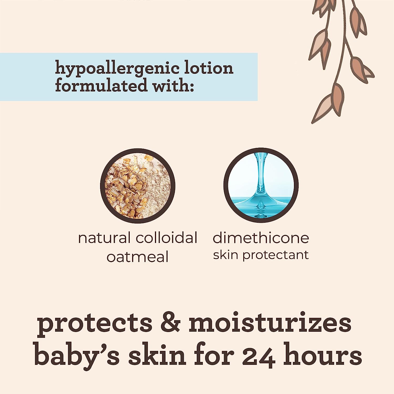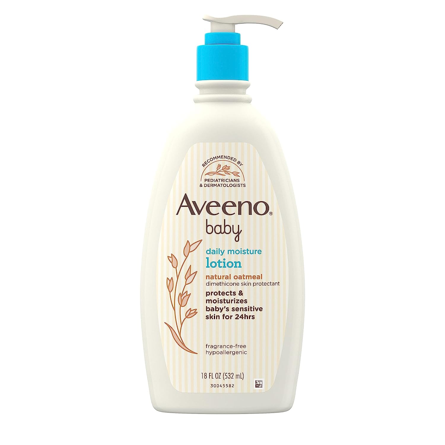 Aveeno Baby Daily Moisture Body Lotion with natural colloidal oatmeal features a nourishing, non-greasy formula that helps protect your little one's delicate skin and moisturizes for a full 24 hours. This nourishing baby moisturizing lotion is specially formulated to be gentle enough for babies. Natural colloidal oatmeal blended with dimethicone skin protectant allows this oatmeal baby body lotion to moisturize for a full 24 hours and helps prevent and temporarily protect chafed, chapped, or cracked skin. From a pediatrician-recommended brand, this hypoallergenic baby lotion can be used every day to keep your baby's skin soft, smooth, and healthy-looking. From Aveeno, a pediatrician and dermatologist-recommended brand, the non-greasy lotion formula is free from fragrance, parabens, steroids, phenoxyethanol and phthalates, so it won't irritate baby's sensitive skin.