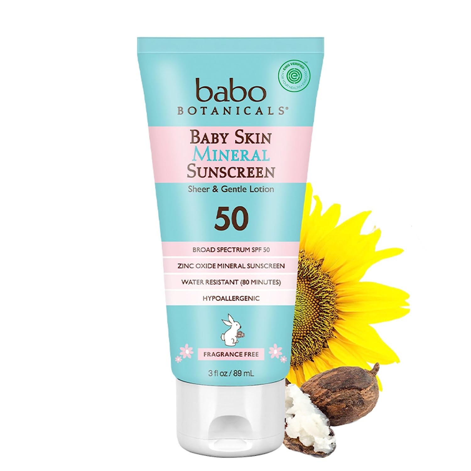 Babo Botanicals Baby Skin Mineral Sunscreen Lotion SPF 50 with 100% Zinc Oxide Active, Non-Greasy, Water-Resistant, Reef-Friendly, Fragrance-Free, Vegan - 3 oz.
