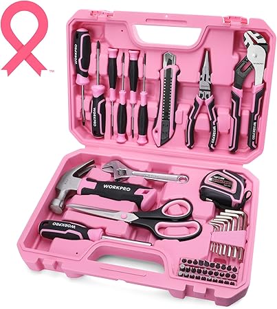 WORKPRO 52-Piece Pink Tools Set, Household Tool Kit with Storage Toolbox, Basic Tool Set for Home, Garage, Apartment, Dorm, New House, Back to School, and as a Gift - Pink Ribbon