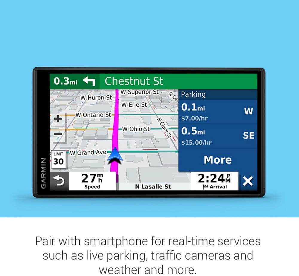 Voice-activated and ability to pair with a compatible and GPS-enabled smartphone for hands-free calling, smart notifications and live traffic via the Garmin Drive App