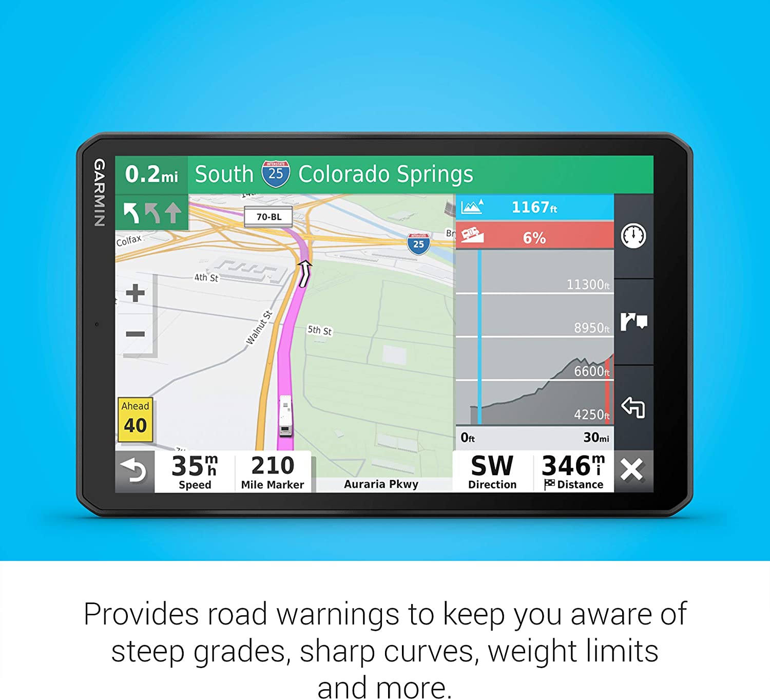 • Provides road warnings to keep you aware of steep grades, sharp curves, weight limits and more