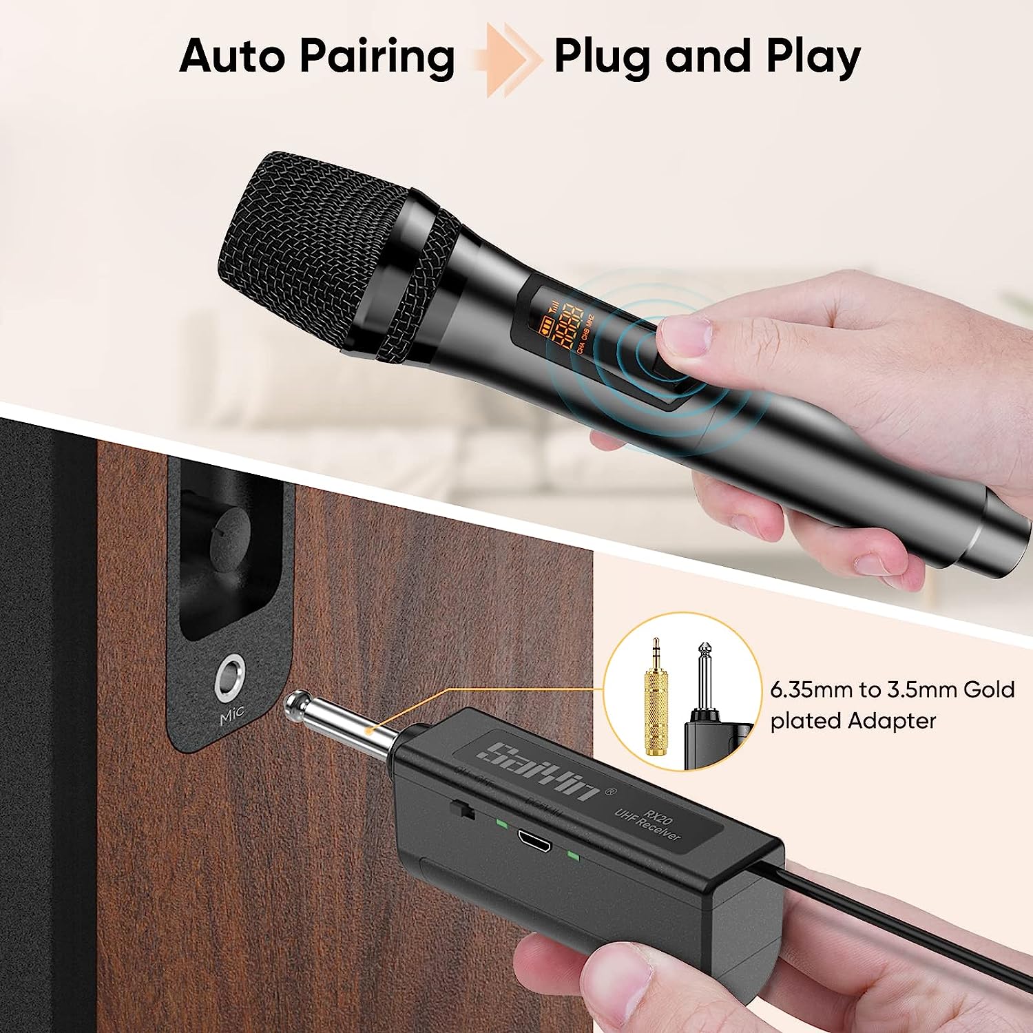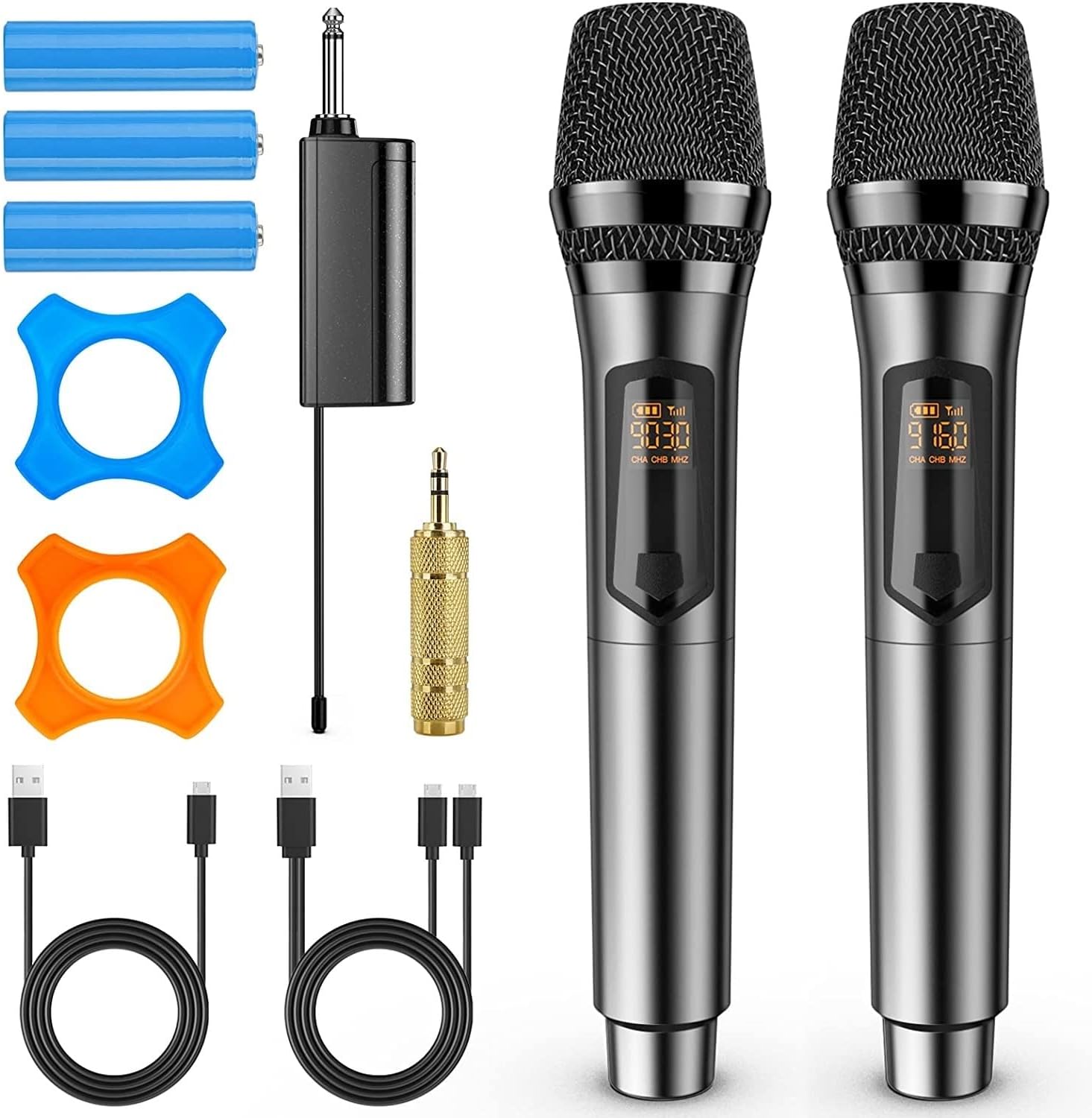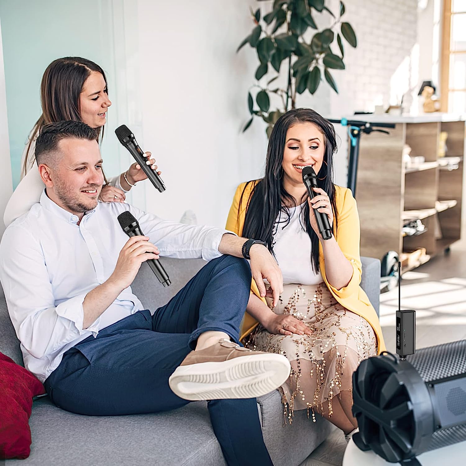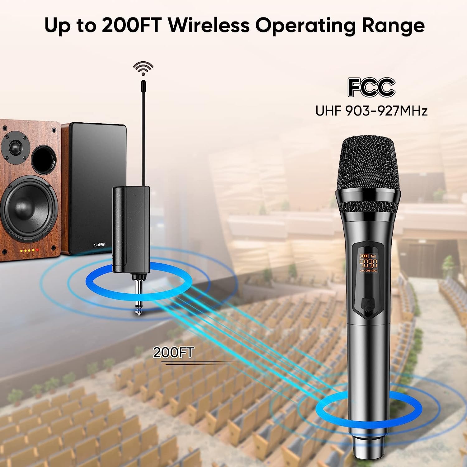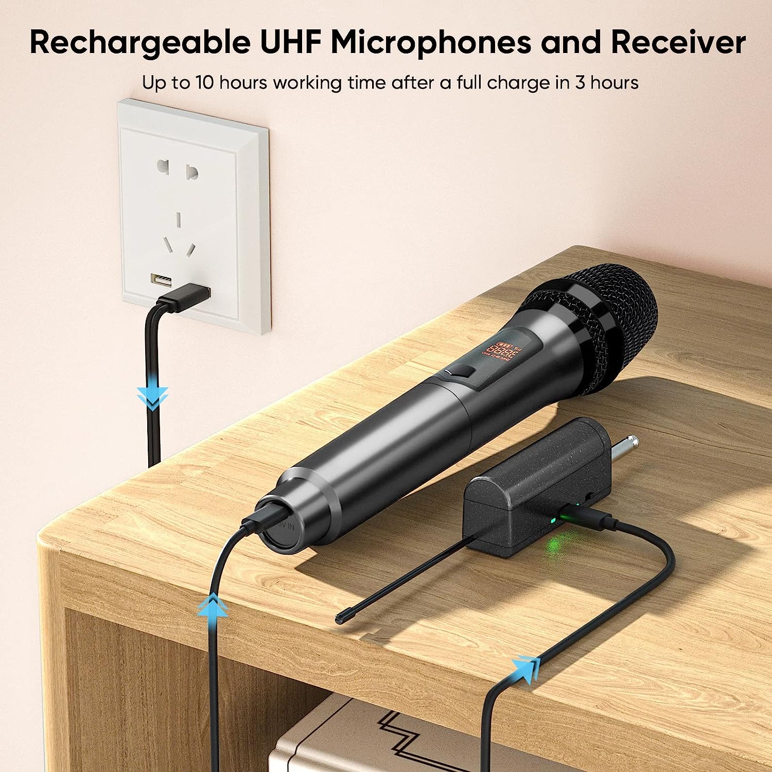 • Wireless Rechargeable Microphone System for karaoke: Updated UHF microphones supports transmission distance up to 200feet (60M) without distortion or loss of sound. Other features like stable signal, no delay, no radiation, anti-howling, anti-jamming, distortion <0.1% and adjustable frequencies.