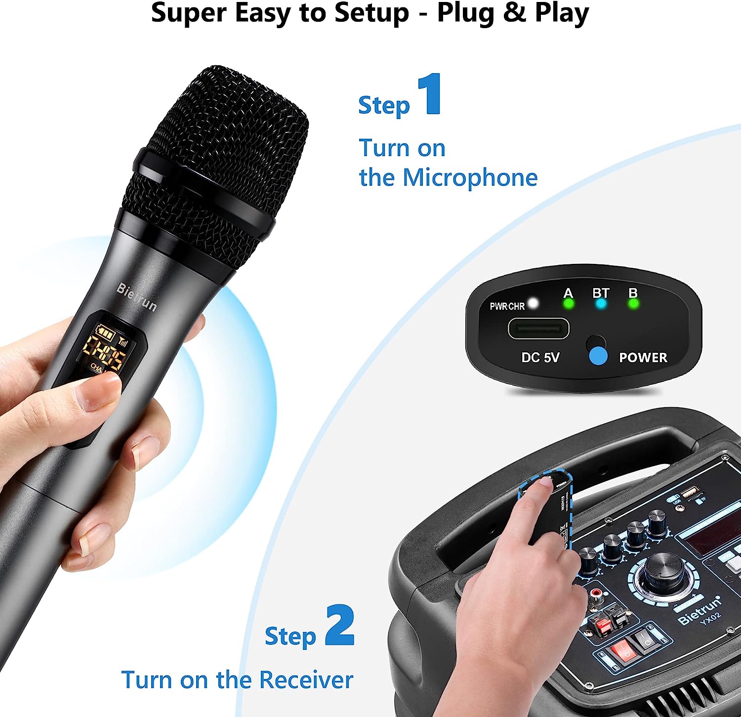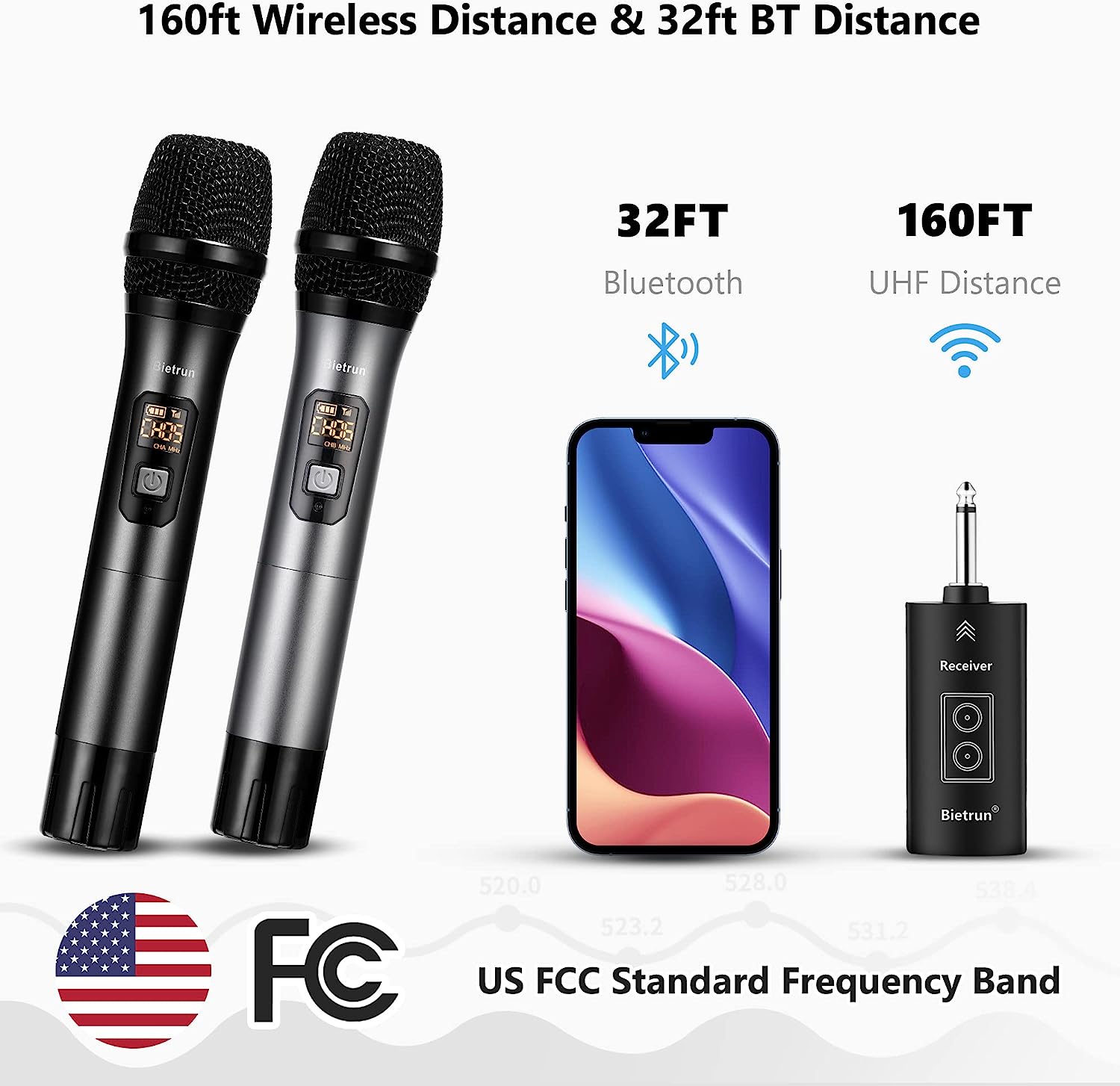 Wireless Microphone with Bluetooth, Professional UHF Dual Handheld Dynamic Metal Mic System Set with Rechargeable Receiver, 160 ft Range, 1/4''Output, for Karaoke Machine, Singing, Amp, PA Speaker