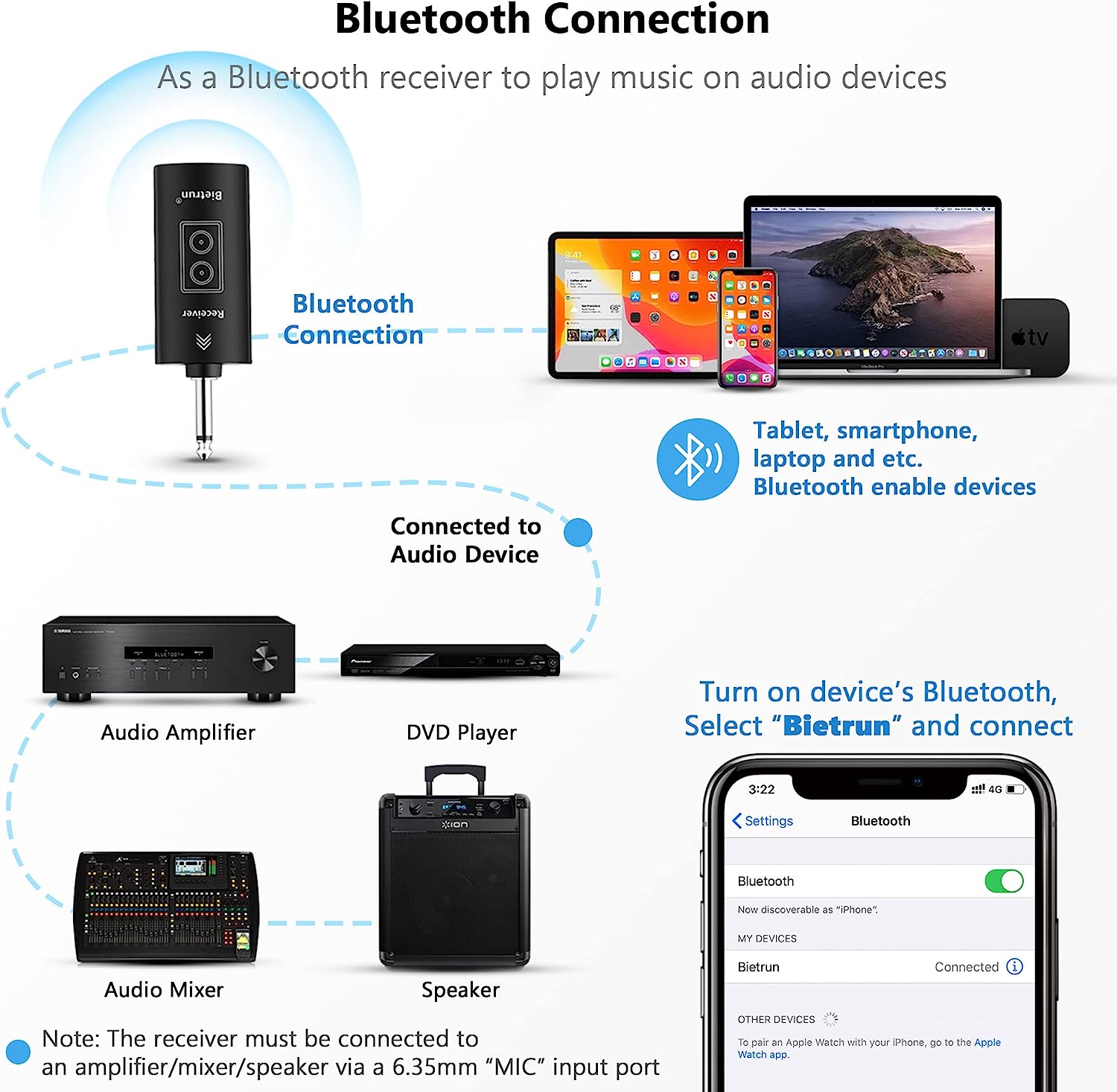 • Plug And Play Microphone: No need pair. ◆Only for input devices with 6.35mm (1/4") or 3.5mm (1/8") MIC interface, E.g speaker, Singing machine, audio amplifier, PA system, Voice amplifier, truck speaker system, Dome speaker system etc.◆Rechargeable Bluetooth receiver, which can be connected to smart phone to karaoke on the speaker. Or as a Bluetooth receiver to play music on old speakers.◆Turn on the receiver, search for the Bluetooth name: Bietrun, Play your music for karaoke.