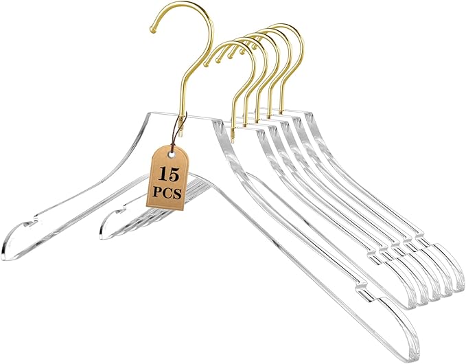 Besser 15 Pack Acrylic Hangers with Gold, Acrylic Clear Hangers, Premium Crystal Dress Hangers Swivel Gold Hook Luxurious Shiny Clothes Hangers(Clear-Style A)