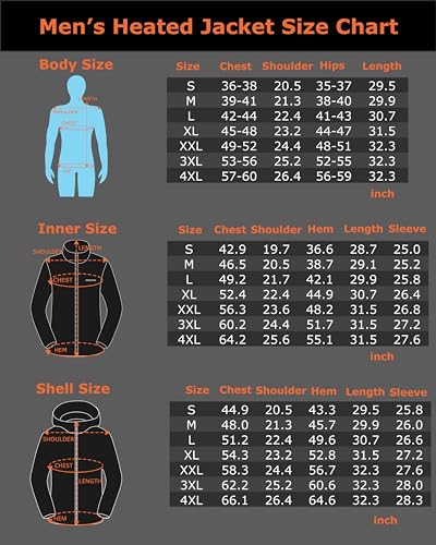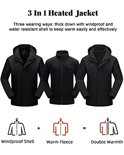 • VERSATILE 3-IN-1 HEATED JACKET FOR MEN - 3-in-1 heated coat set for all weather conditions. Both the hooded water-resistant shell & the inner fleece-heated clothing can be worn on their own or together. Wear the fleece on its own provides great comfort & enough warmth for most cold days; Wear just the shell as a lightweight water-resistant layer; or wear them together to stay dry and warm.