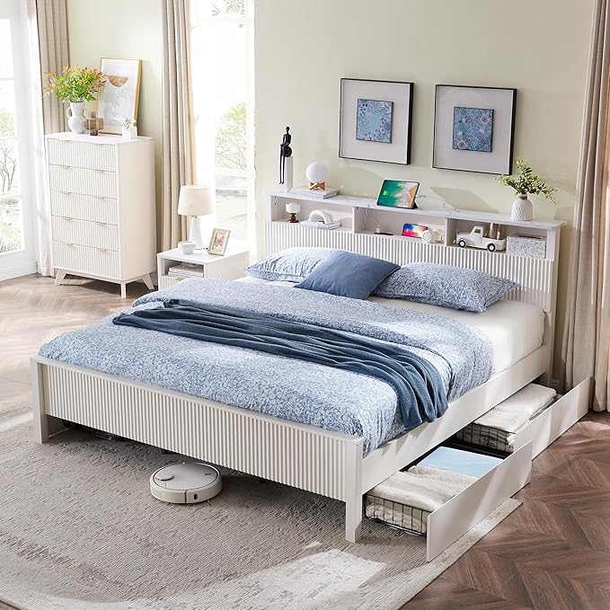 T4TREAM Fluted Panel King Bed Frame with Bookcase Headboard & Charging Station, Modern Wood Platform Bed with 4 Drawers, Wood Slats Support, Noise Free, No Box Spring Needed, Off White