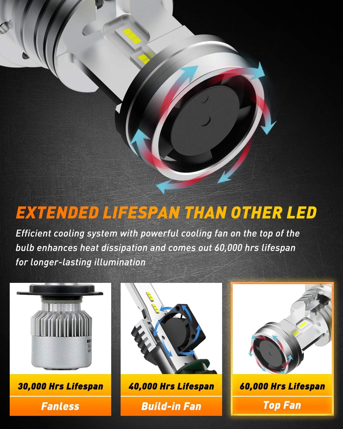 • Longer Lifespan than Other LED: Whole aviation aluminum h4 bulbs body and unique powerful cooling fan on the top of the 9003 bulb, bring more heat dissipation than other h4 LEDs and come out 60,000 hours+ longer-lasting illumination