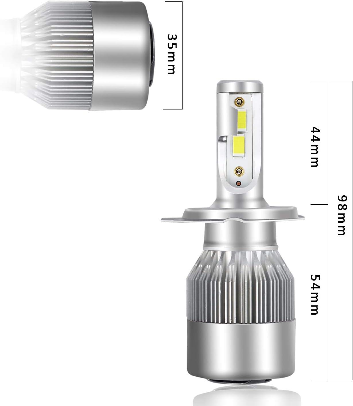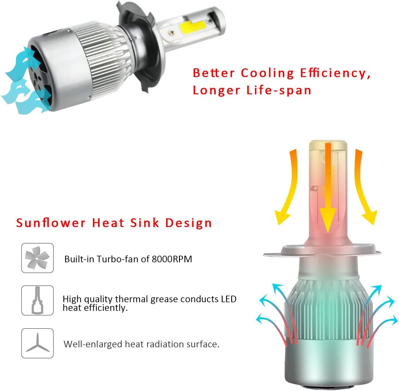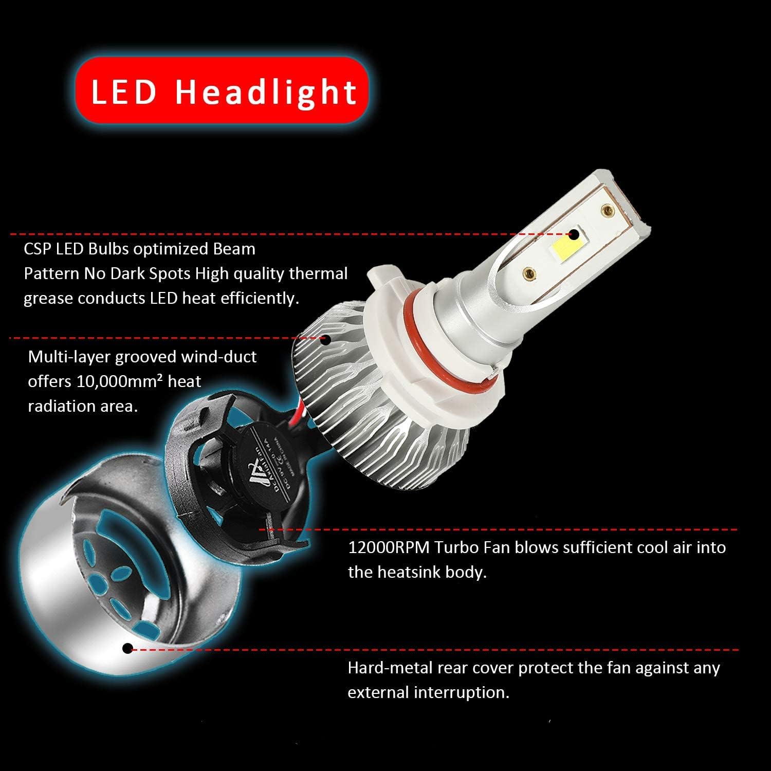 • Cooling Mechanism: Cooling is the most important issue for any LED headlight bulbs. The most important factor for a cooling mechanism is SURFACE AREA. As the most classic model, this LED is bult with a cooling area of over 10,000 square millimeters. This cooling area ensures the brightness and lifespan of this LED bulbs.