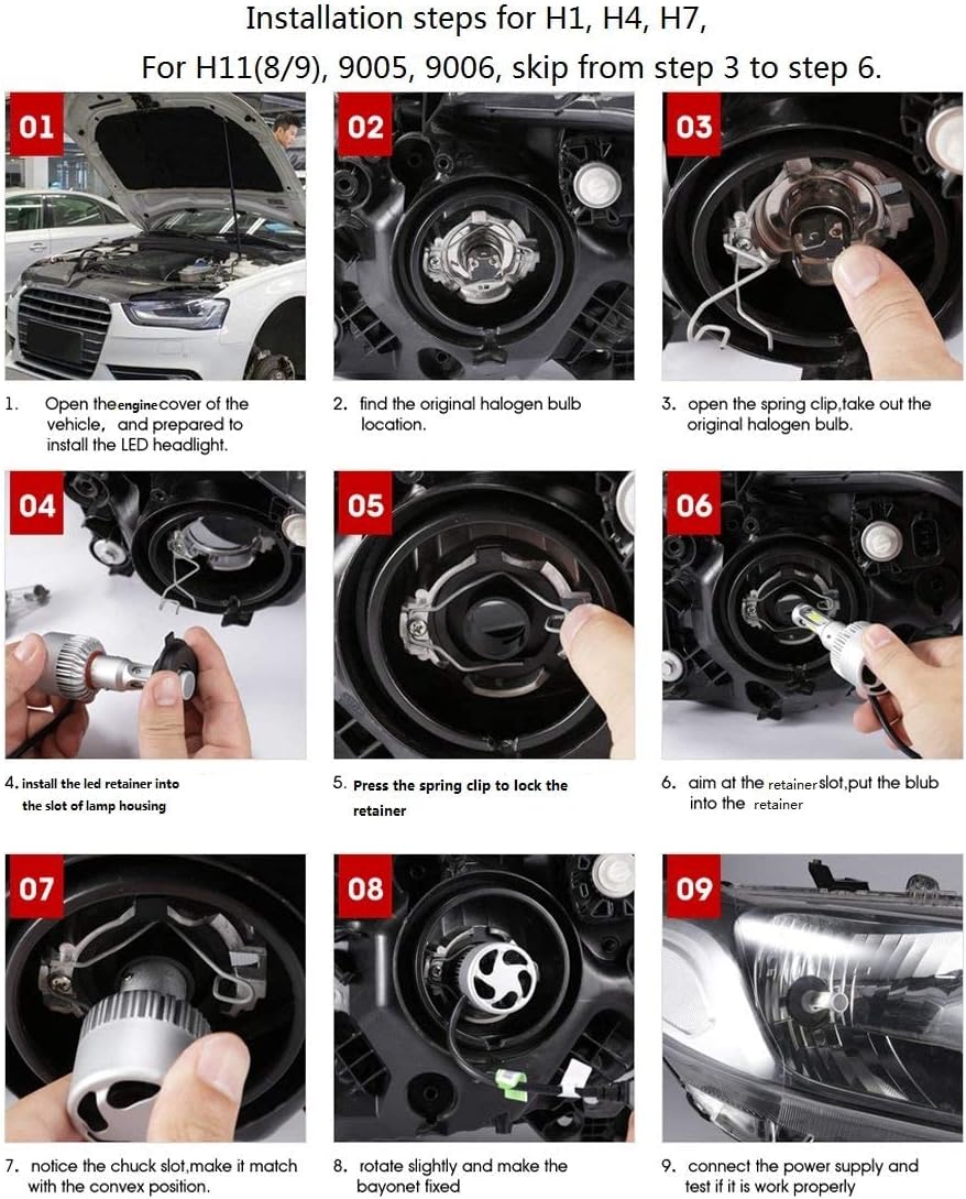 • FAST INSTALLATION: The LED headlight bulbs are designed to be a plug & play DIY product, both in software (CanBus-Ready) and hardware (machined couplings or terminals). THE LED headlight bulb works with most of the current vehicles. If you are still not sure about the right LED light models, please confirm with us before buying.