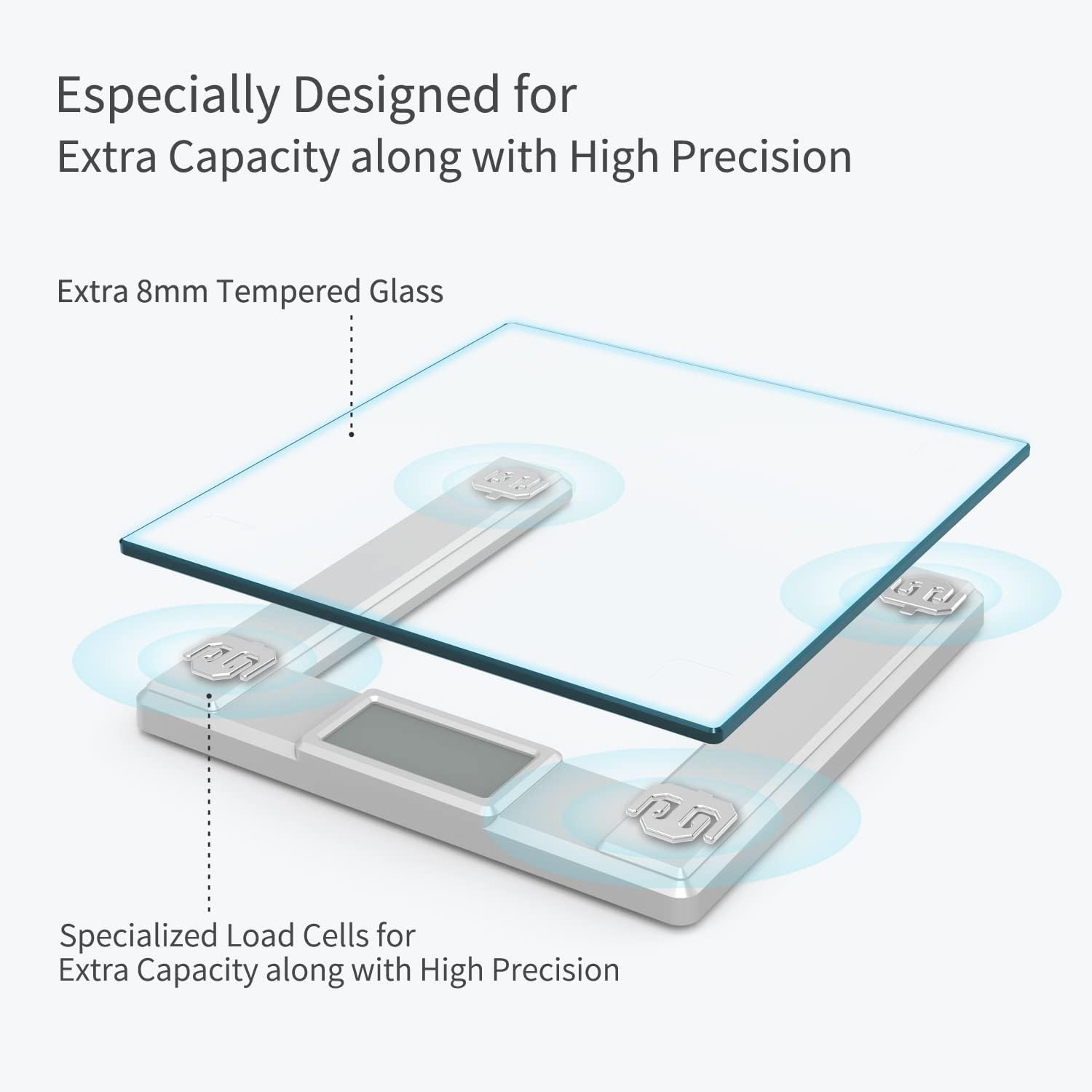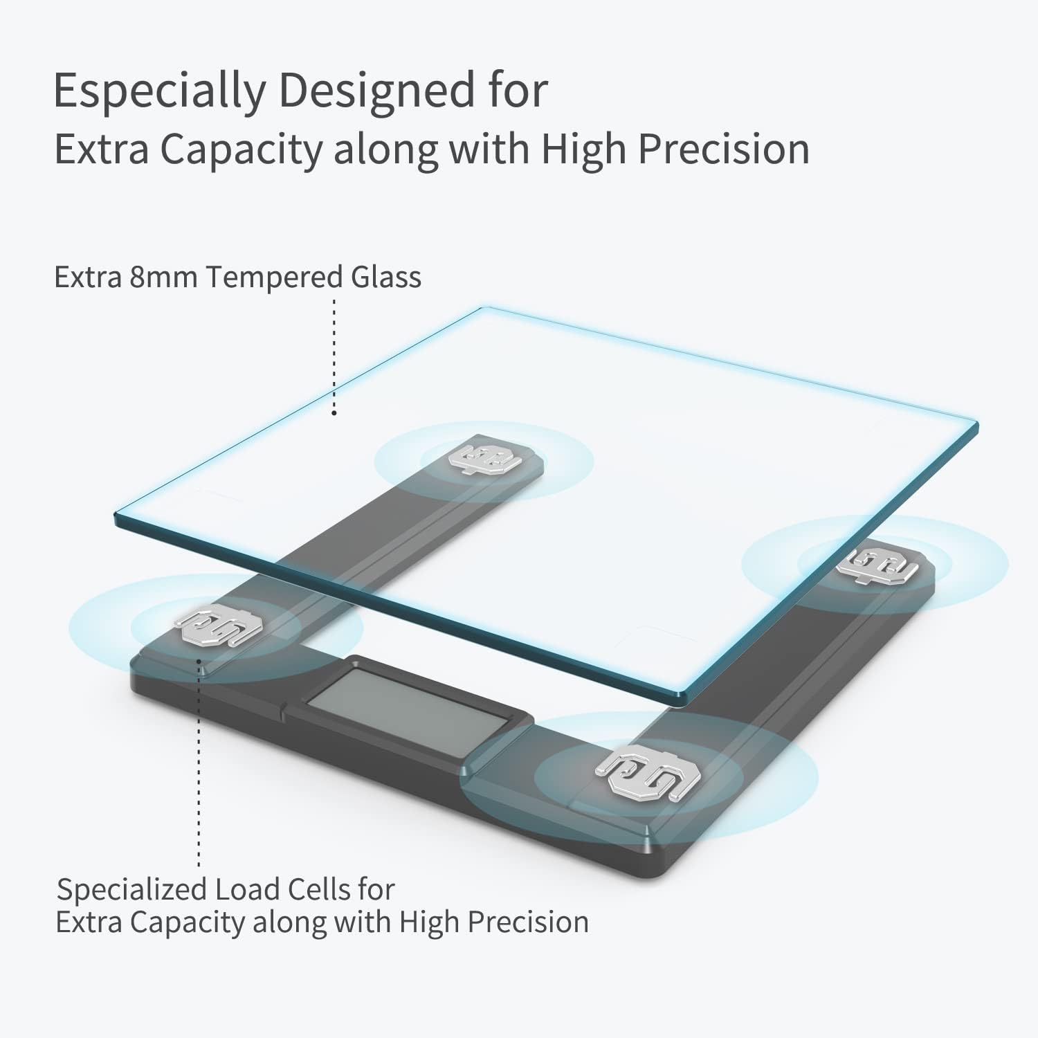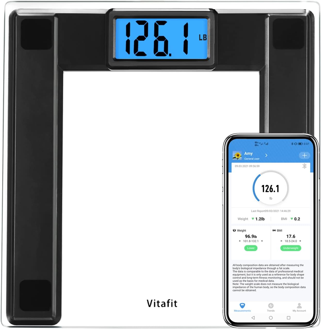 Vitafit 550lb Extra-High Capacity Digital Bathroom Scale for Body Weight and BMI Via Smart APP, Weighing Professional Since 2001, 8mm Tempered Glass and Step-on, Extra Large Blue Backlit LCD, Silver