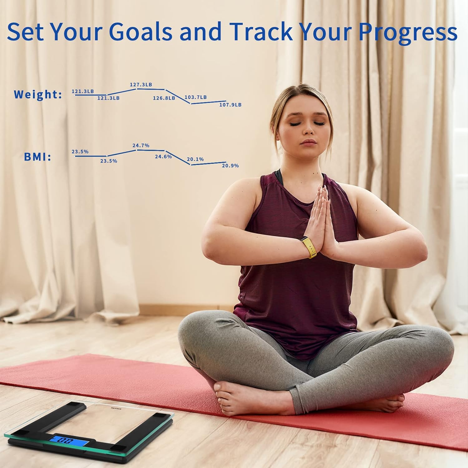 • ORIGINAL DESIGN - The smart weight scale is our original design with the idea: Extra Sturdy and Precise, along with the superb comfortable size 12.6 x 12.2in (320x310mm) tempered glass in superb 8mm thickness. Our whole team sincerely wishes it is not only the perfect scale for your fit, but also the perfect decoration for your power.