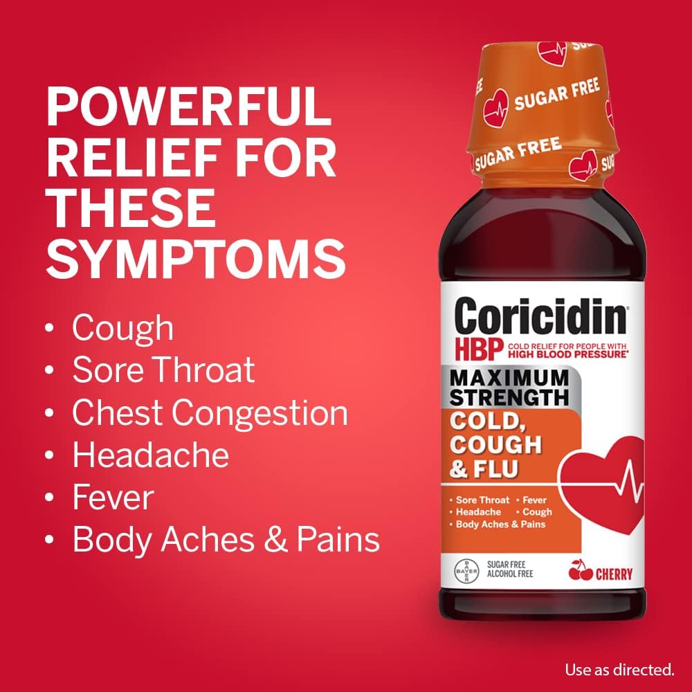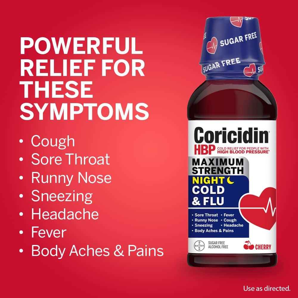 Coricidin HBP Cold & Flu Maximum Strength Day & Night Liquids are cold medicine for adults with high blood pressure that deliver decongestant-free, powerful cold and flu relief without raising your blood pressure. Each dose of the daytime cold and flu medicine contains acetaminophen as a fever reducer and pain reliever and a cough suppressant to control coughs. The night formula contains acetaminophen, an antihistamine, and a cough suppressant for adults. Both the day and night cold medicines are sugar-free and alcohol-free and relieve aches and pain, headache, cough, sore throat and fever. The night time formula alleviates runny nose and sneezing to help get the rest you need. To quickly and effectively relieve cold and flu symptoms, simply take Coricidin HBP maximum strength cold & flu medicine as directed on the package. Keep your cold in check with Coricidin HBP, #1 doctor recommended cold and flu brand for people with high blood pressure.