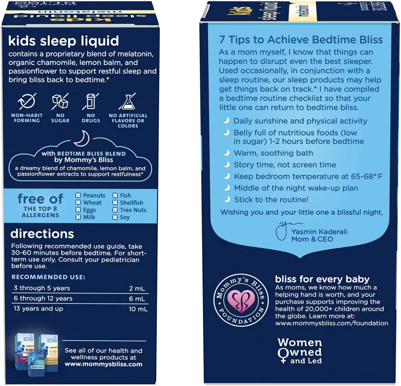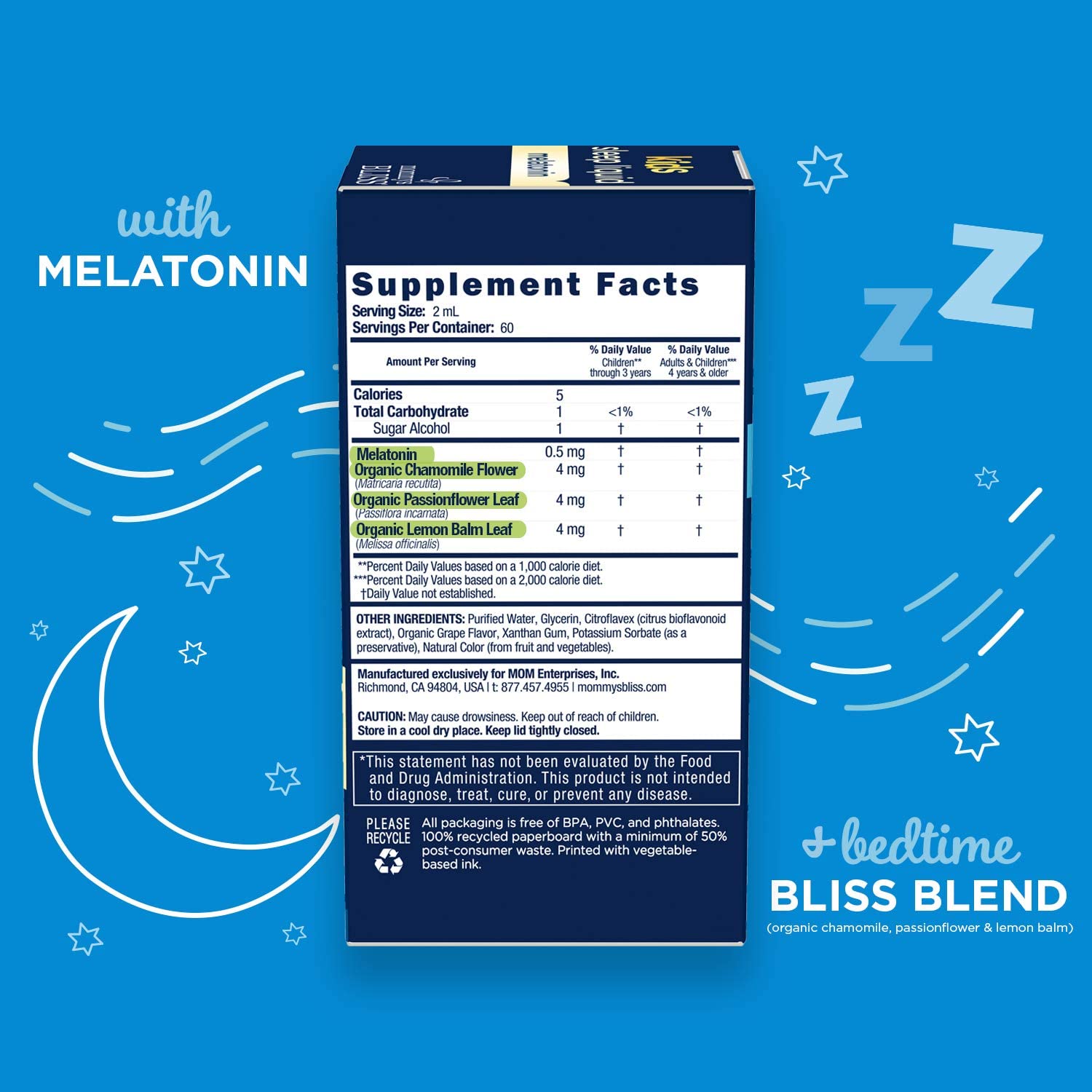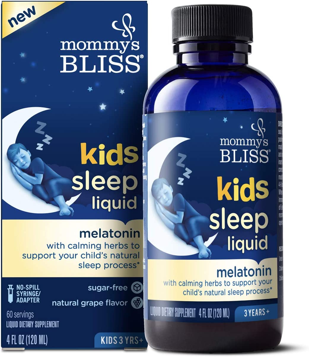 Mommy's Bliss Kids Sleep Liquid with Melatonin and Calming Herbs helps support your child's natural sleep process. This sugar-free liquid has a natural grape-flavored taste and contains melatonin, organic chamomile, organic lemon balm, and organic passion flower. It does not contain artificial colors and flavors, sugar, drugs, binders and fillers. This proprietary Bedtime Blend promotes restful sleep, is non-habit forming, and is also free of the top 8 allergens. This way, alongside a steady sleep schedule, can help return bliss to your child's bedtime. Created for moms, by moms, Mommy's Bliss was created to safely and gently bring families back to bliss.