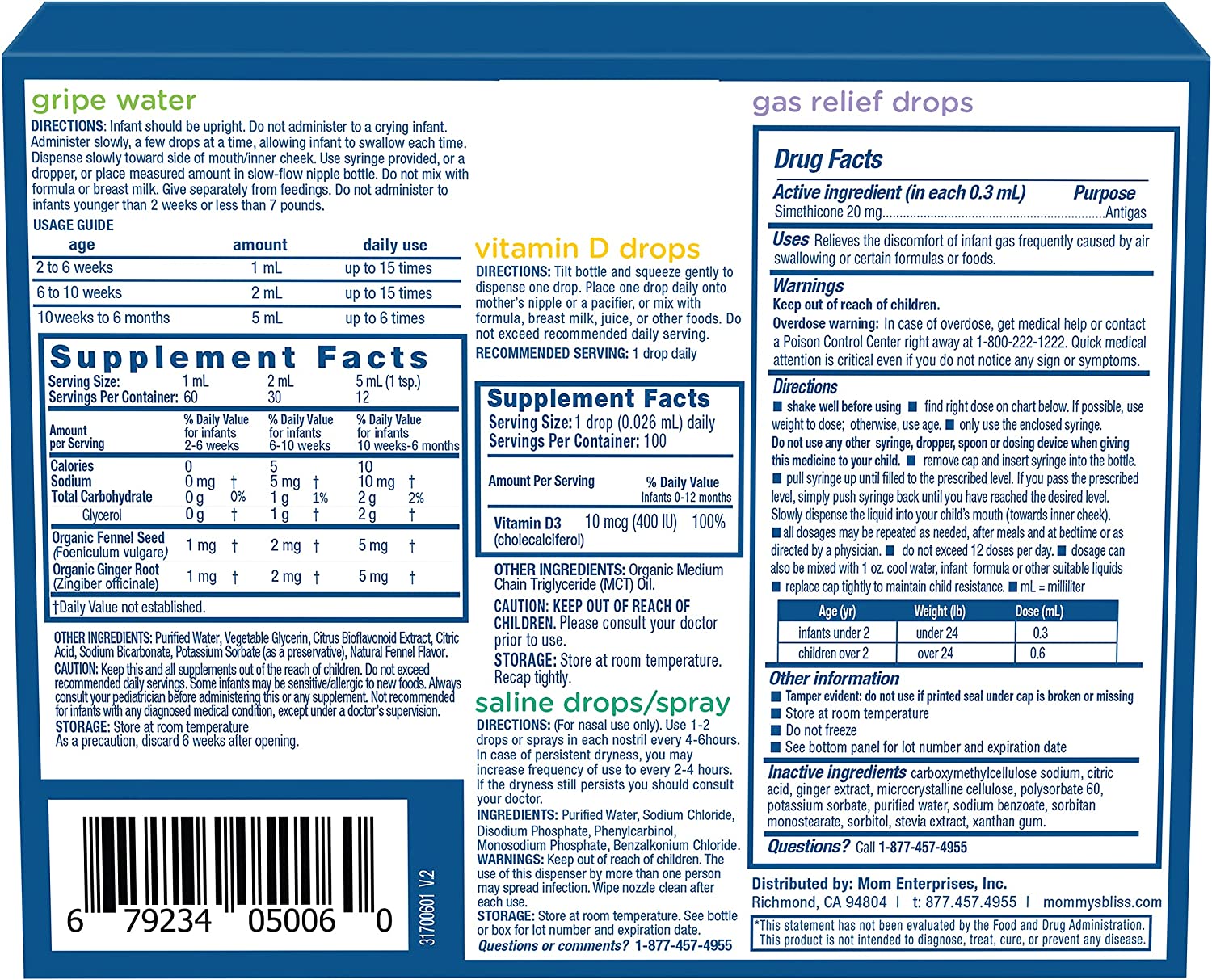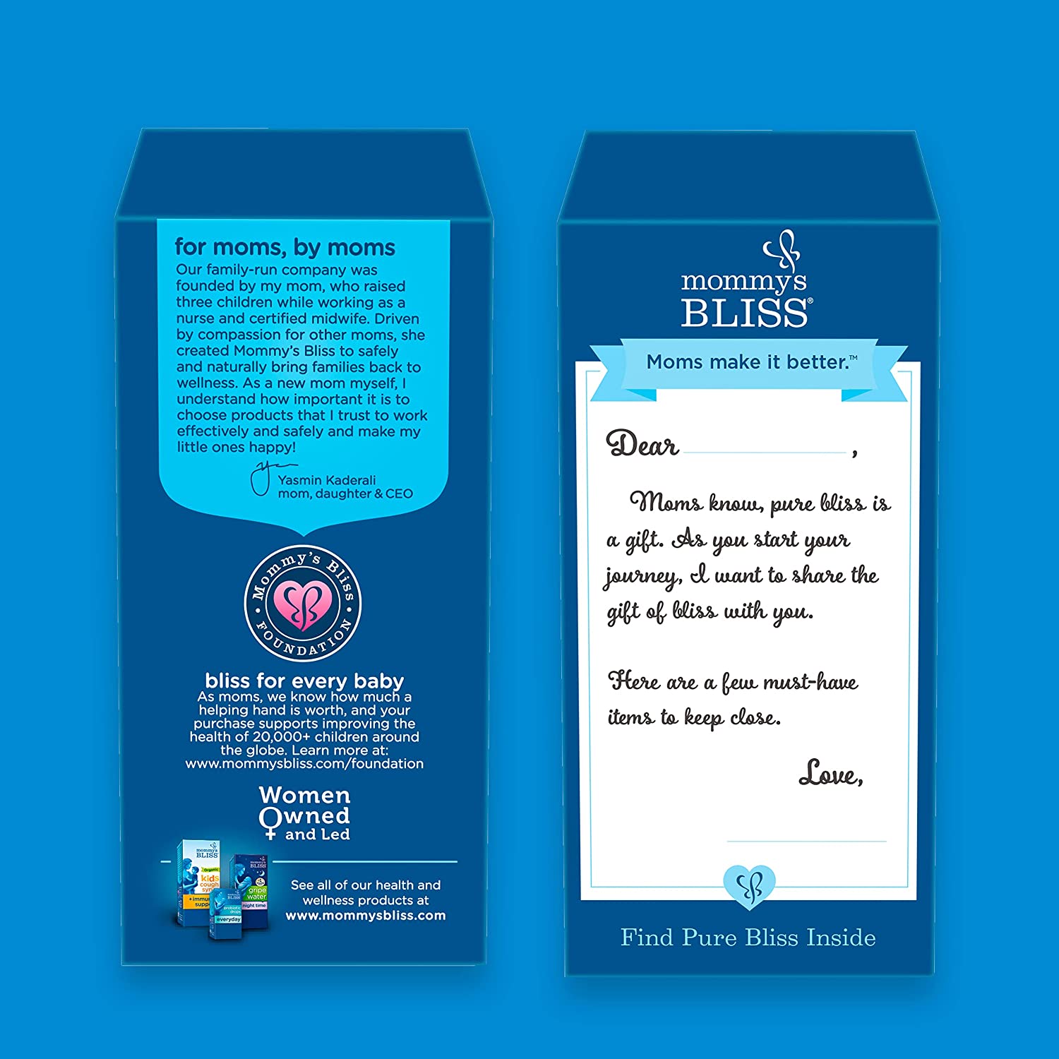 Mommy's Bliss Newborn Essentials Gift Set contains a selection of some of our best-selling items perfect as a baby shower gift for expectant moms or for everyday baby needs, including safe and trusted solutions for baby’s tummy troubles, sniffles, and everyday wellness. Our Baby Essentials include Gripe Water Original, the no. 1 selling gripe water brand in the U.S., designed for babies 2 weeks and older, is gentle, safe, and effective with organic ginger and fennel extracts that ease your baby's stomach discomfort associated with gas, colic, hiccups, teething, & general fussiness. Our top-selling Organic Baby Vitamin D Drops with 400IU of vitamin D3 per serving as recommended by the American Academy of Pediatrics to promote healthy growth and bone development - and newer research shows D3 supports immunity. Fast-acting Baby Gas Relief Drops with simethicone, a pediatrician recommended solution for relieving gas quickly in newborns and older, with natural ginger flavor your baby will love – safe to use after every feeding when used as directed. Non-medicated, hypoallergenic Saline Drops/Spray for newborn nasal relief is a gentle and effective solution to clear mucus, clean, moisturize, and soothe delicate nasal passages, with dual action bottle for easy administration, and no burning or stinging. Mommy's Bliss helps ease baby's discomfort and brings back smiles. From gripe water to help calm colic or tummy troubles, to organic baby cough syrup, baby probiotic drops, or baby vitamins, its our goal to help you find your parenting bliss.