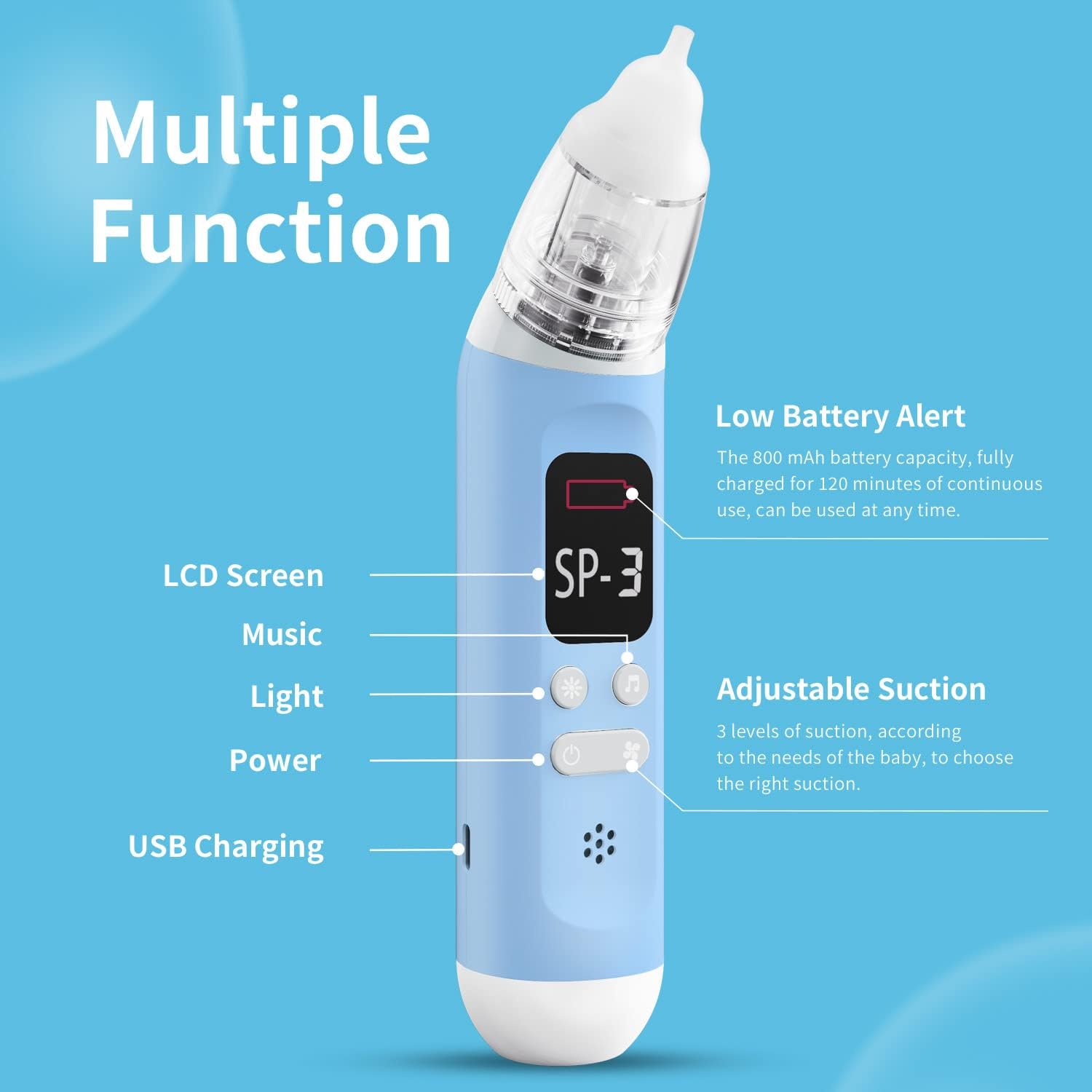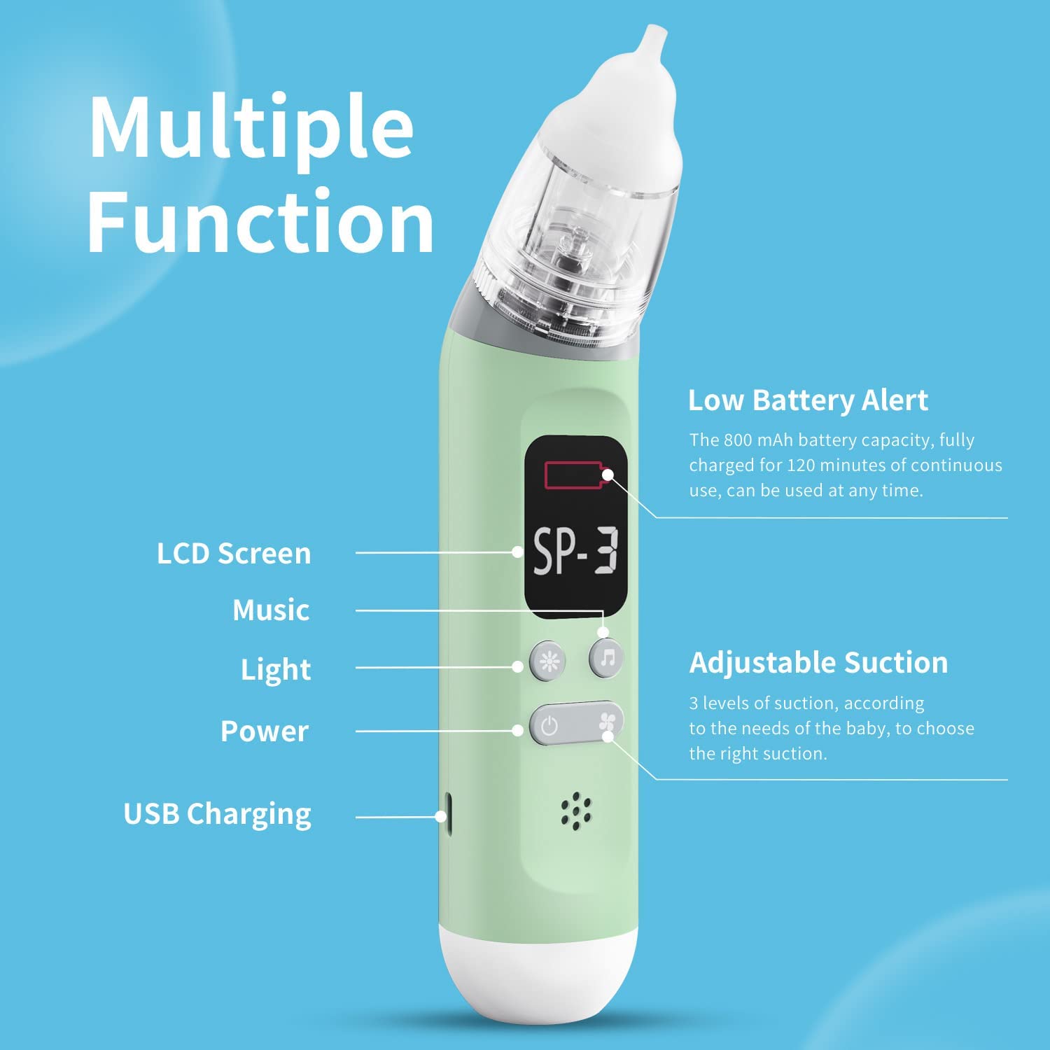 • [Comfortable Music] When your baby has a stuffy nose, he will feel anxious and even start crying. This nose sucker has 3 nursery rhymes. You can choose the music your baby likes to calm him down. Then use the nasal aspirator to quickly suck out the snot.