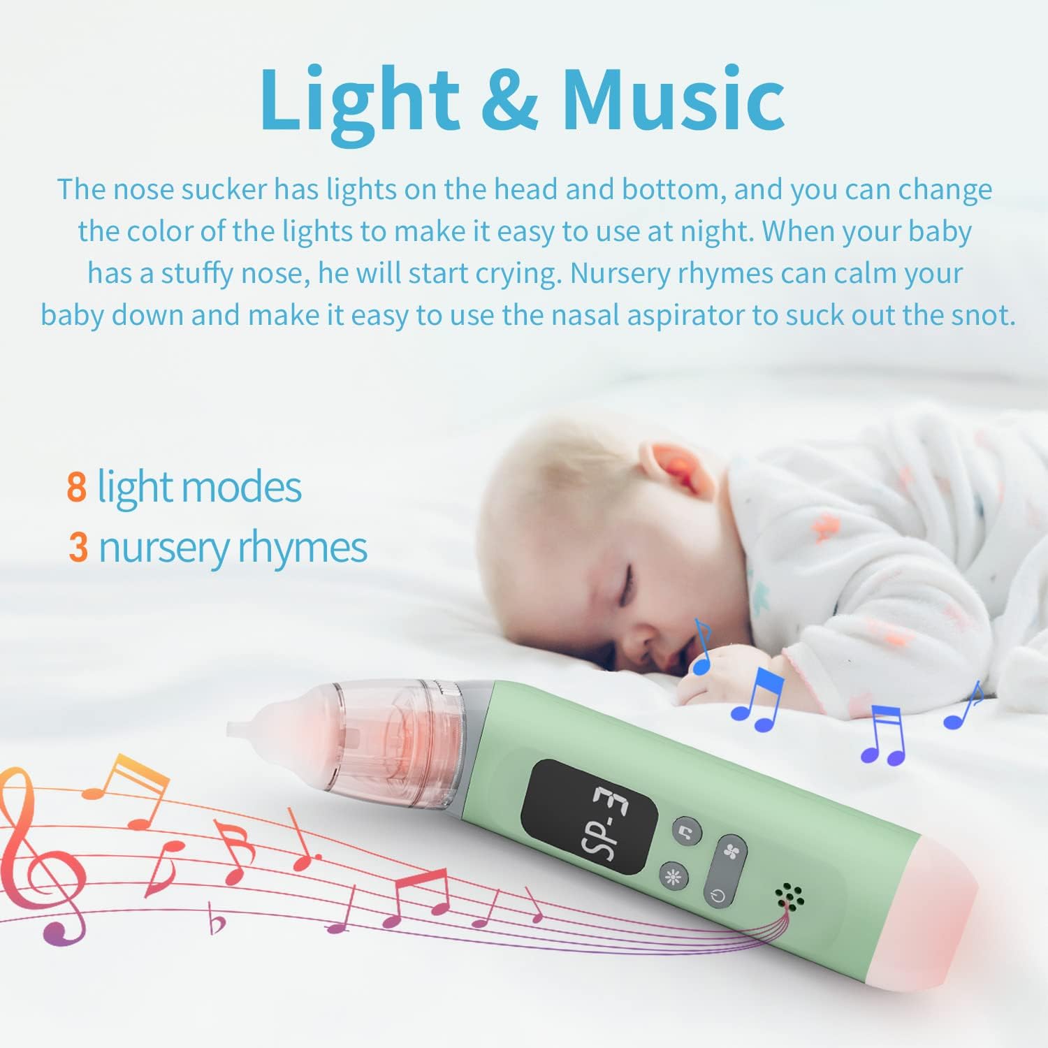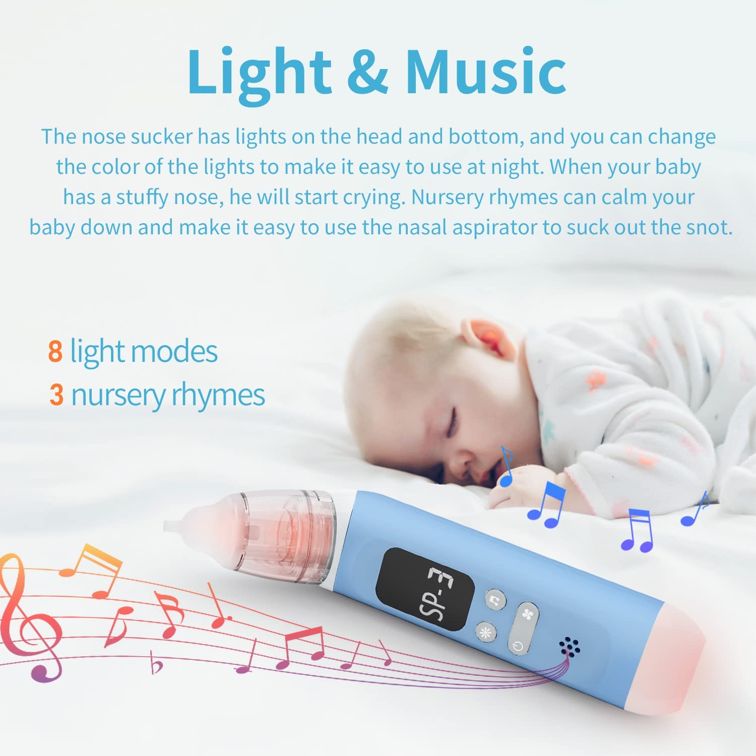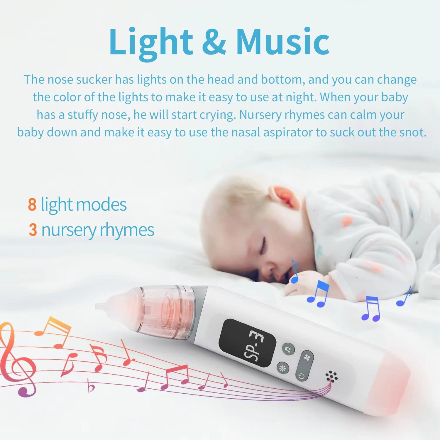 Nasal Aspirator for Baby, Electric Baby Nose Sucker with Adjustable 3 Levels Suction, Rechargeable Booger Sucker for Babies with 8 Light Modes and 3 Nursery Rhymes