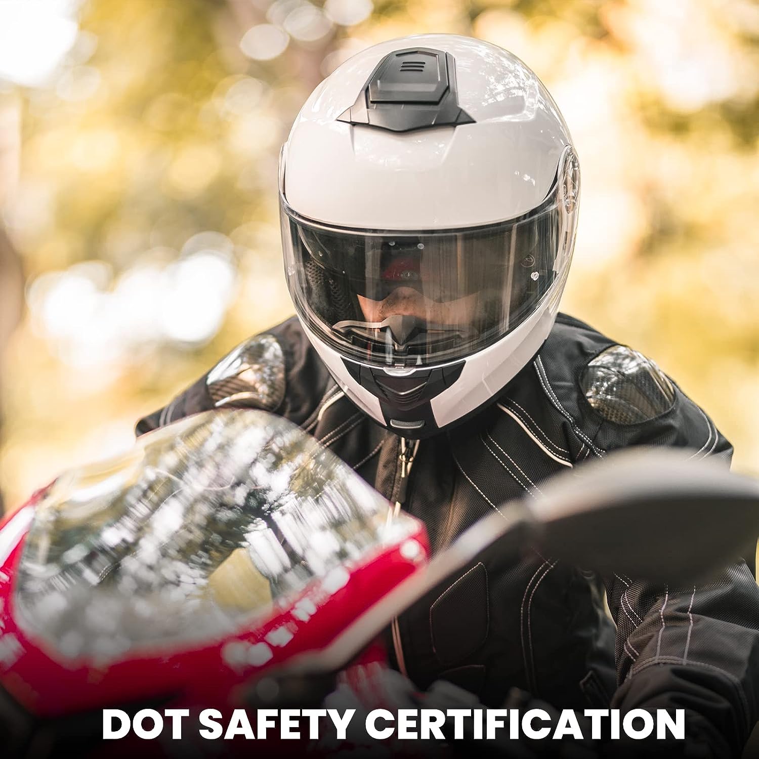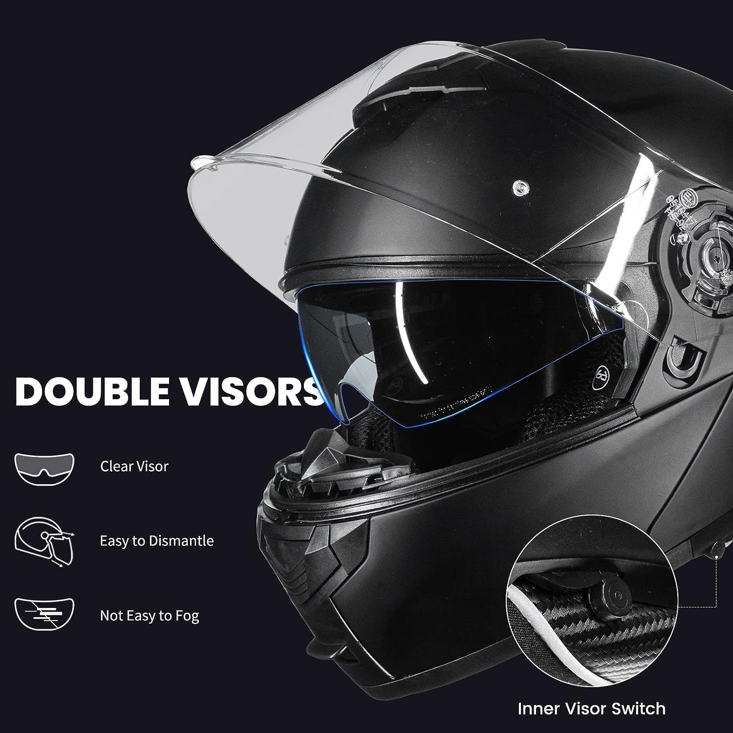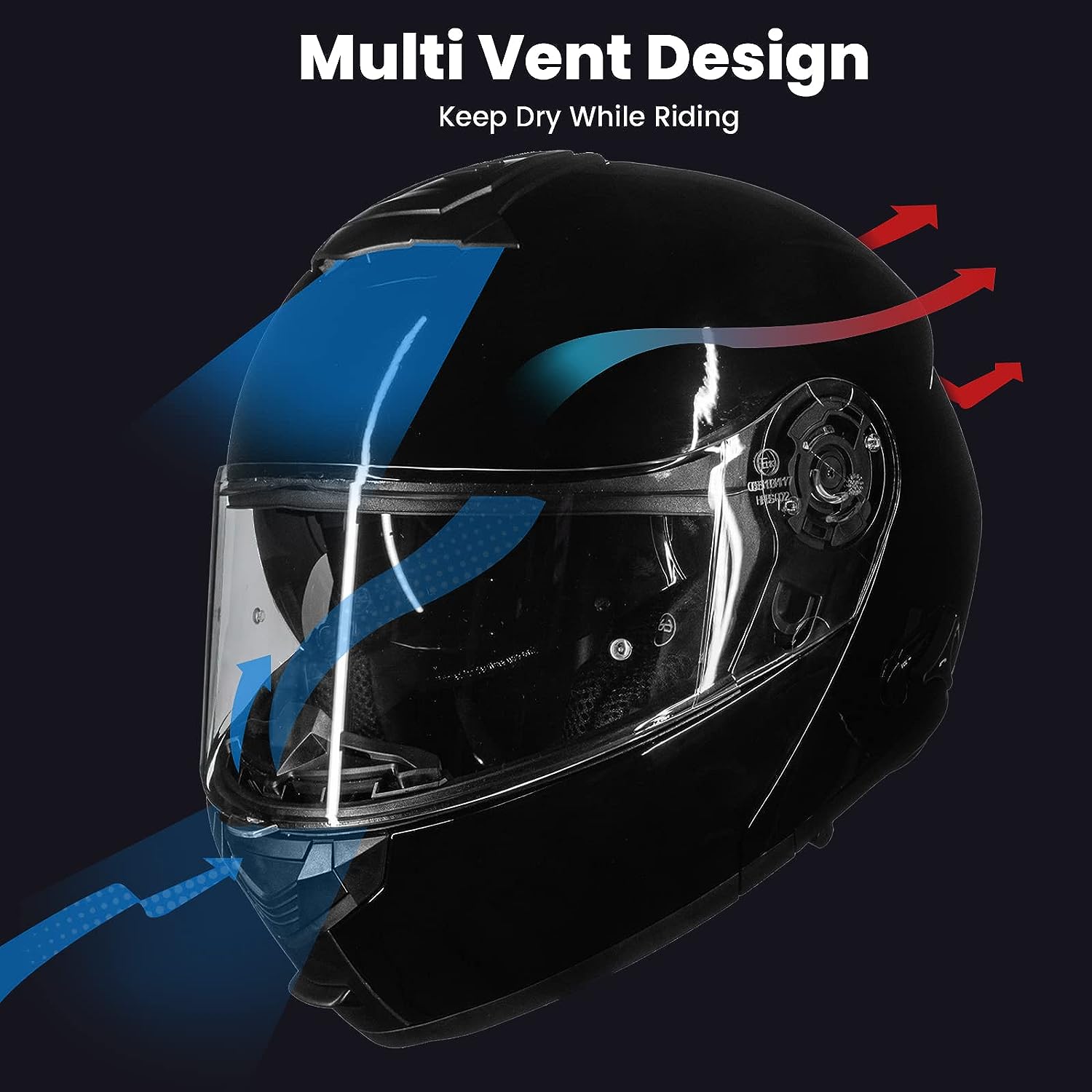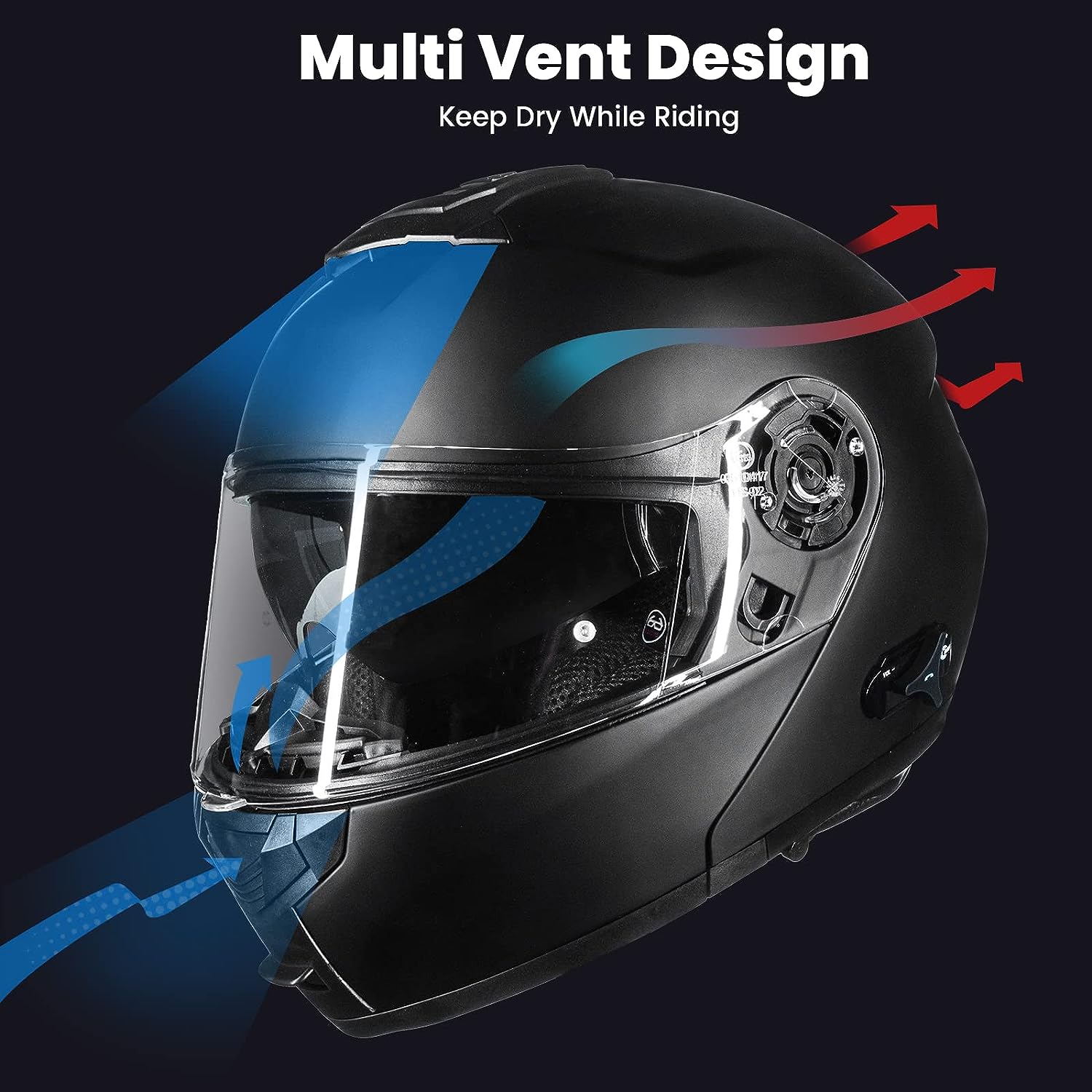 • DESIGN: DOT safety standard and high quality ABC shell with EPS liner. The flip design not only adds convenience, but also has catches for fixing the helmet, greatly increasing safety. Multiple vents for air circulation and make sure you can breathe fresh air.