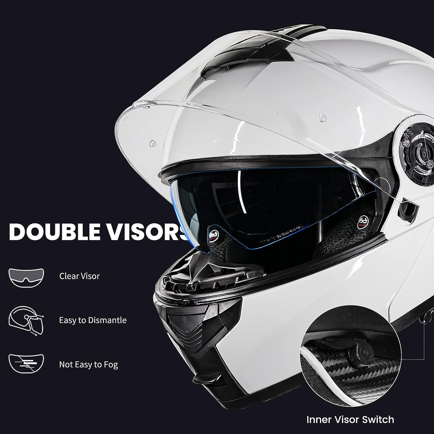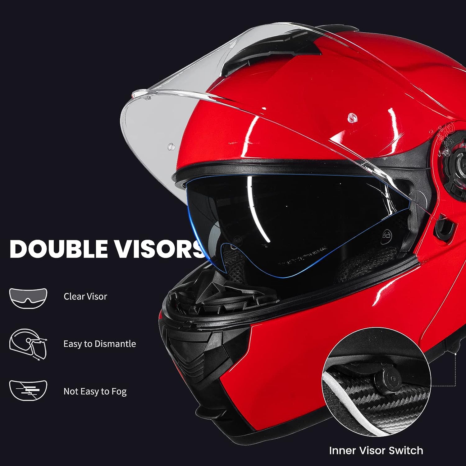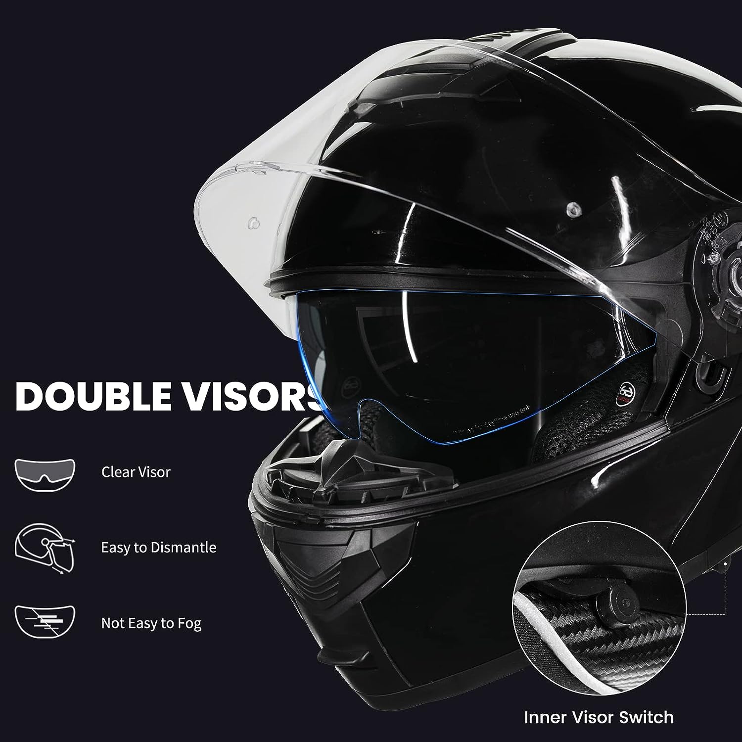 • VISOR: Dual visors mean more choices and protection, sun visor can protect your eyes from direct sunlight and the clear visor can provide a wide view. You can also add a heated visor according to your needs.The Pinlock nail at the visor designed for placing your pinlock 30 lens.