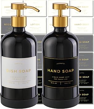 16oz Glass Soap Dispenser with Stainless Steel Pump, 21 Waterproof Labels, Non-slip Protective Silicone Pad, Set of 2 for Bathroom & Kitchen (Gloss Black Bottle/Brushed Gold Pump)