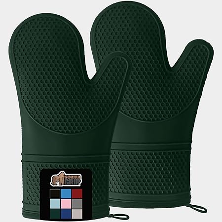 GORILLA GRIP BPA-Free Soft Silicone Oven Mitts, Heat Resistant Thick Cotton Lined Cooking Mitt Set, Long Flexible Potholders Protect Hands, Kitchen Essential Waterproof Gloves, 12.5" Hunter Green