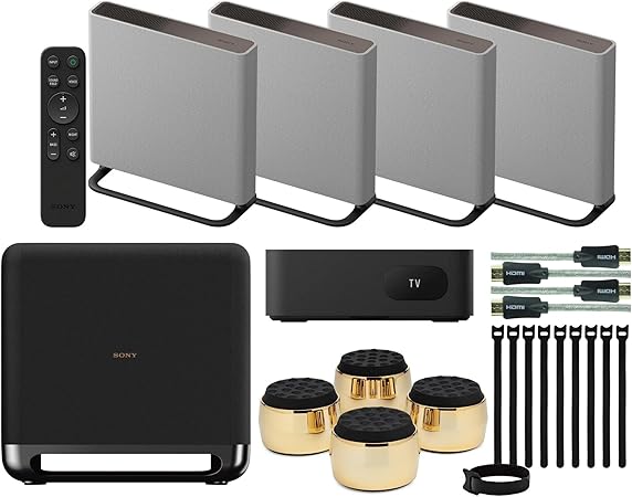 Sony BRAVIA Theater Quad Home Theater Surround Sound System with 4 Wireless Speakers (Gray) Bundle SASW5 Wireless Subwoofer, Monitor Isolation Pads, HDMI Cable, and Cable Ties (5 Items)