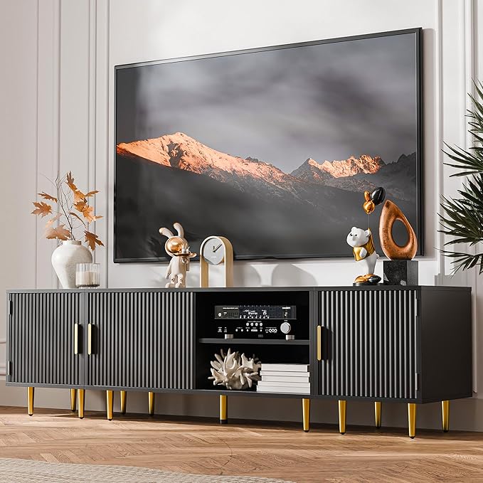 Cozy Castle 75" Modern Fluted Stand for TV up to 80", Mid Century Entertainment Center with Storage and Open Shelves, Media Console for Living Room, Bedroom, Black
