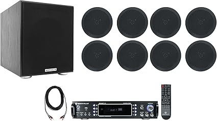 Rockville Bundle: RPA60BT V2 Bluetooth Karaoke Amp Mixer Bundle with (8) HC55-16 in-Ceiling Home Theater Speakers, Rock Shaker Subwoofer Sub, RCDR25B Dual RCA to Dual RCA Pro Audio Cable (11 Items)