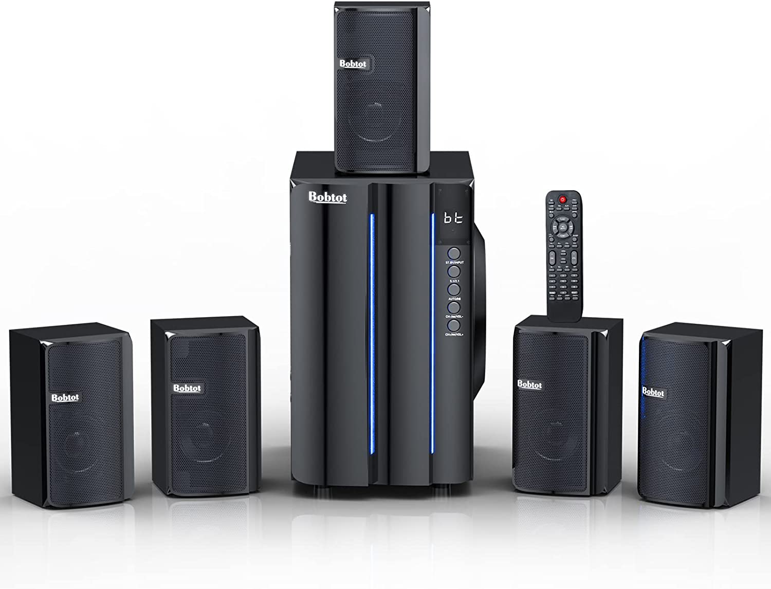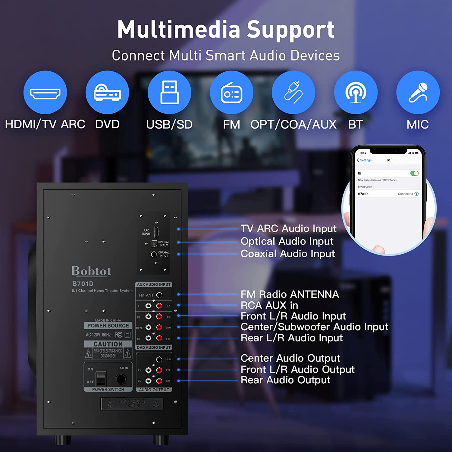 Bobtot Home Theater Systems Surround Sound Speakers - 800 Watts 6.5 inch Subwoofer 5.1/2.1 Channel Home Audio Stereo System with HDMI ARC Optical Bluetooth Input for 4K TV Ultra HD AV DVD FM Radio USB