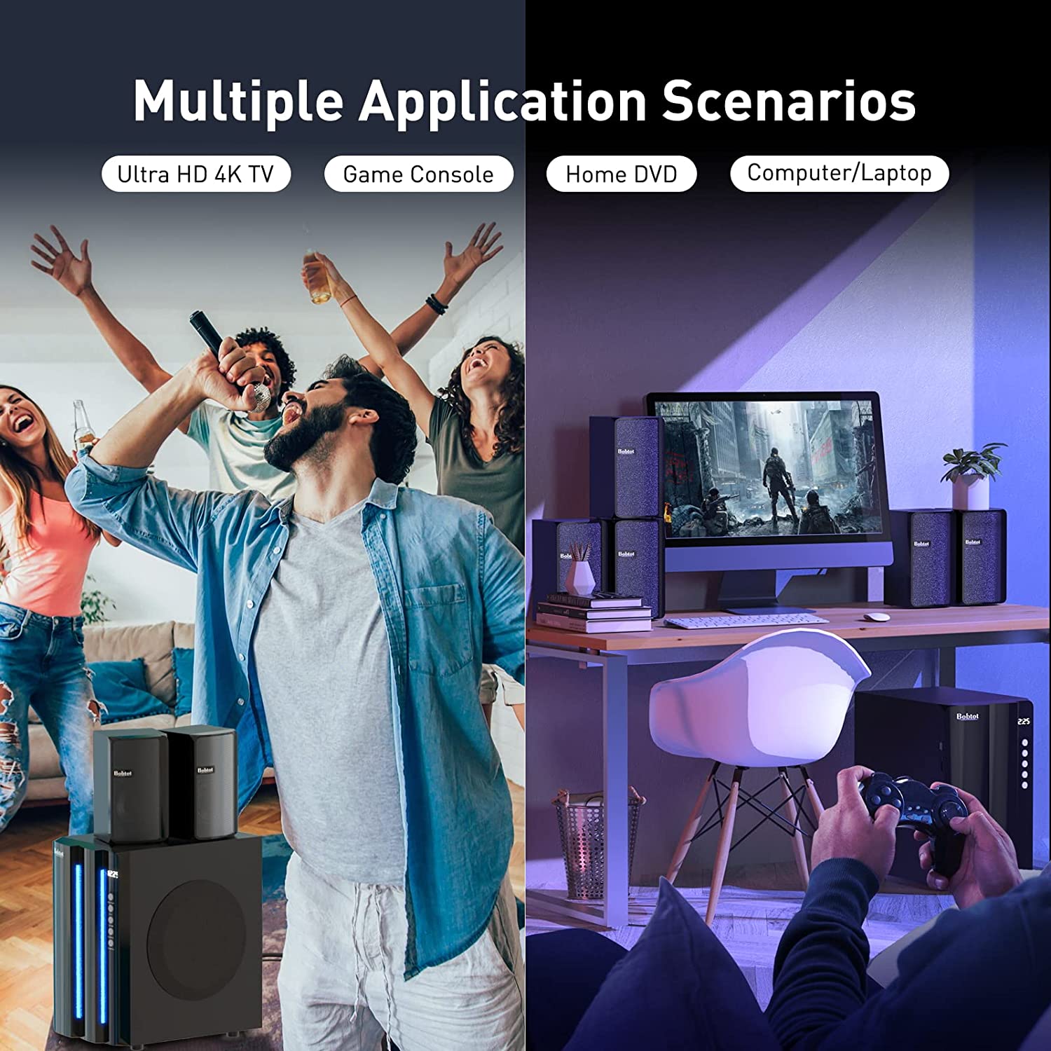 • Multiple Application: Easily plug and play, speakers are widely used for numerous scenarios such as Ultra HD 4K TV, game console, home DVD, computer, laptops, Projector. It's very suitable for watching movies, watching football games, partying, and e-sports games with friends at home