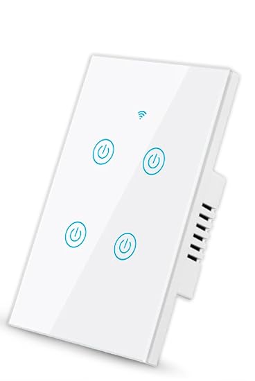 WiFi Smart Light Wall Light 4 Gang Switch, White, Compatible with Alexa & Google Assistant, 2.4GHz, iOS&Android, No Hub Required, Remote Control, Tuya App, Touch Panel, Voice Control, Home Automation
