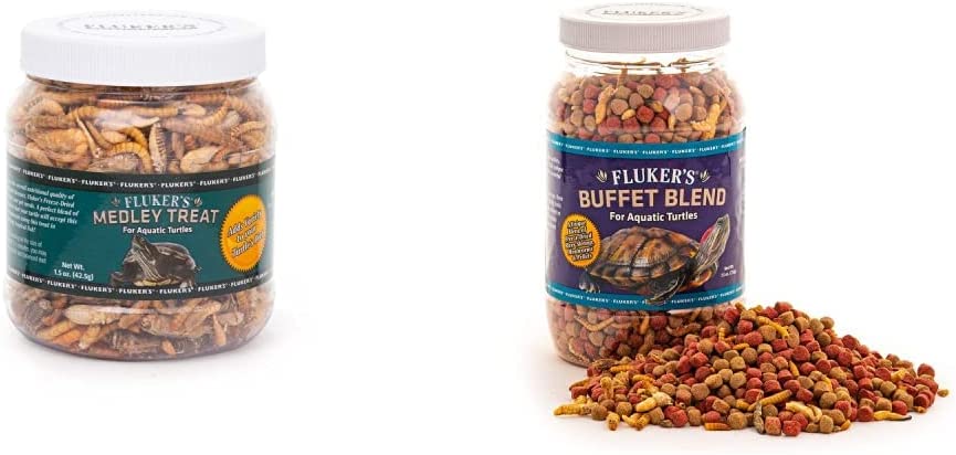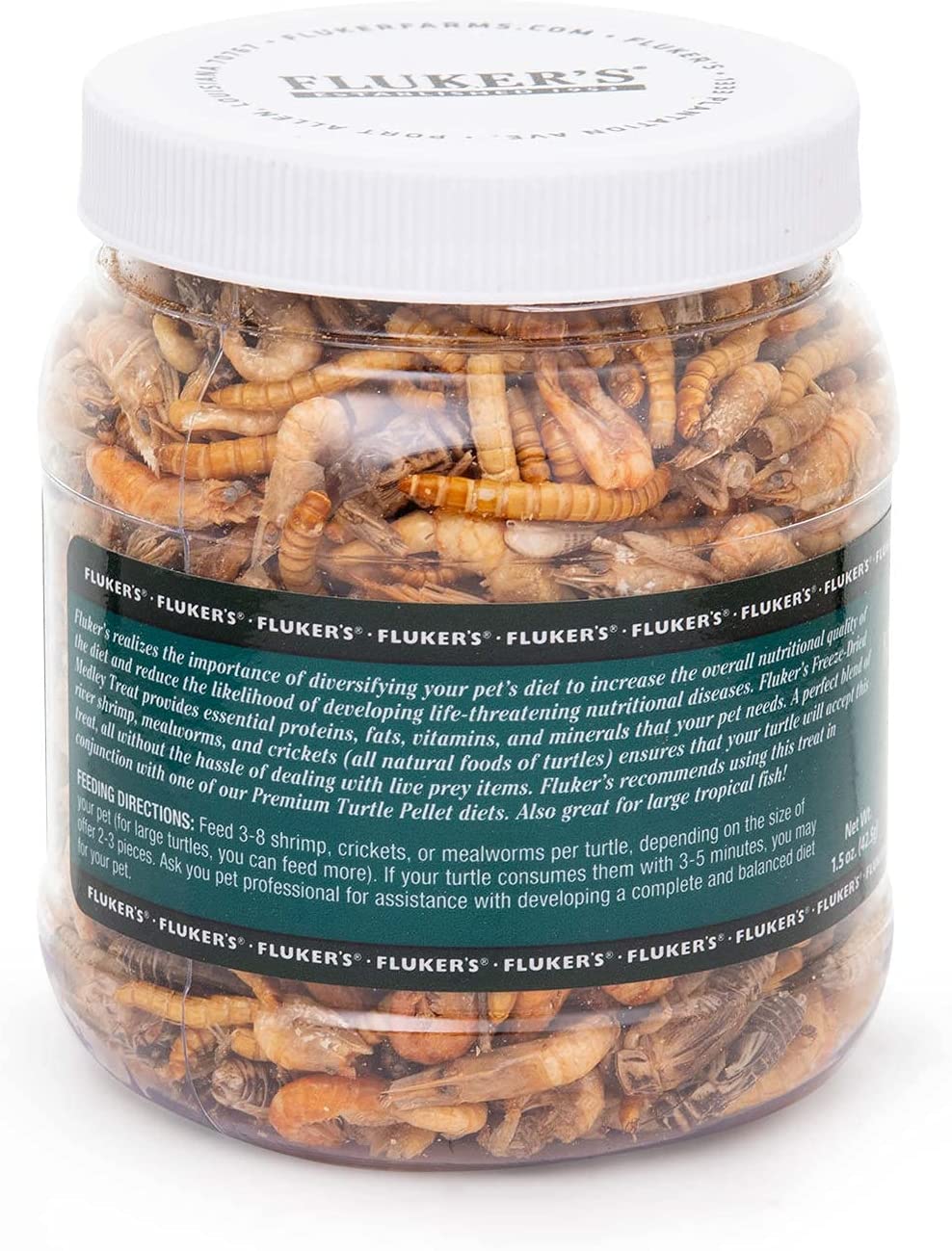 Fluker's aquatic turtle medley treat food. Freeze dried blend of river shrimp, mealworms and crickets. Provides essential proteins, fats, vitamins and minerals. Comes in 1.5-ounce jar.