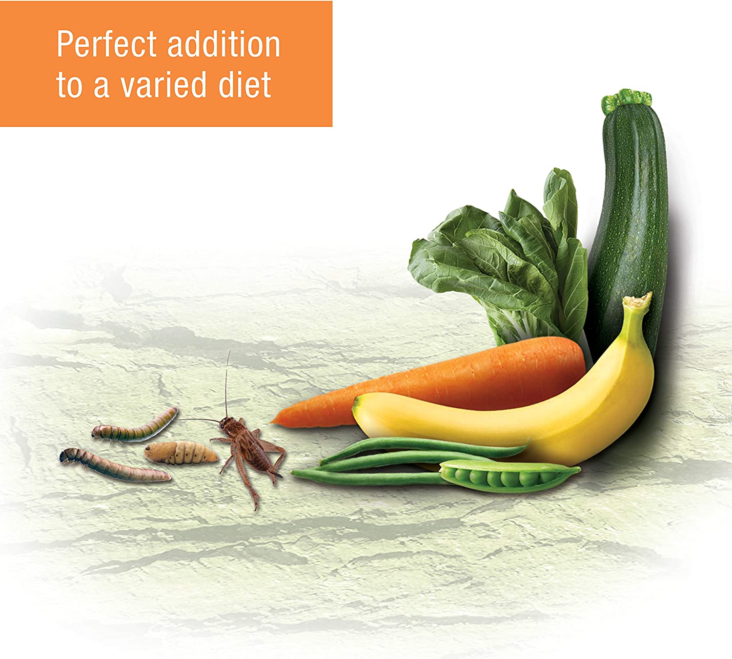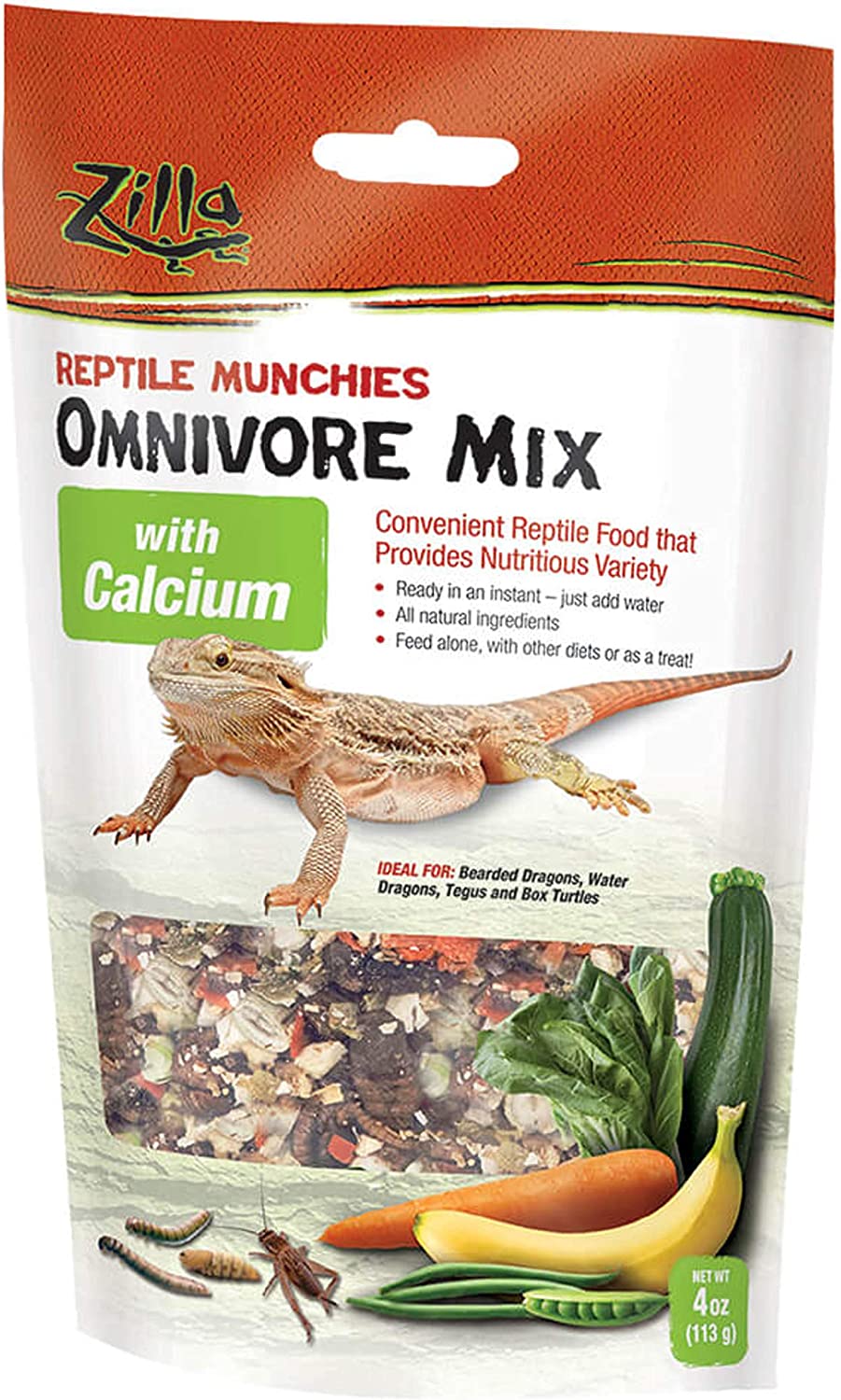 Nutritious Zilla Omnivore Mix Reptile Munchies with Calcium contain dehydrated pieces of vegetables and insects that are quick and convenient to feed with no refrigeration required! Added calcium helps keep your pet healthy. Just add water and vitamin supplements. The natural ingredients are ideal for feeding alone, in addition to leafy greens, pellet diets or as a treat.