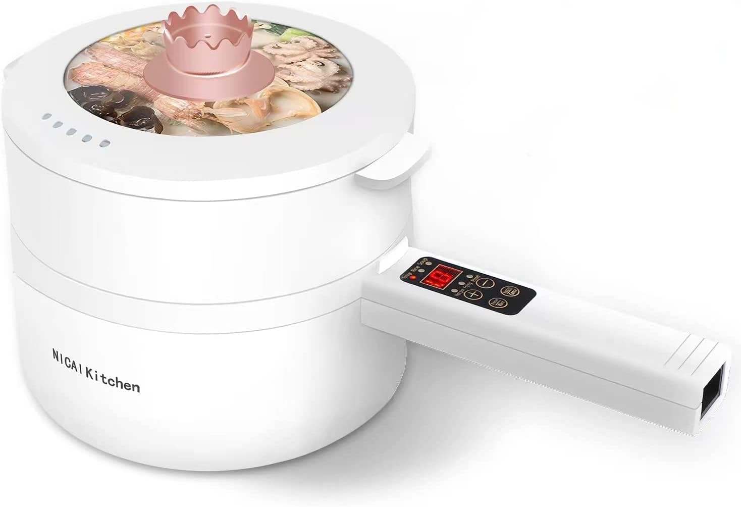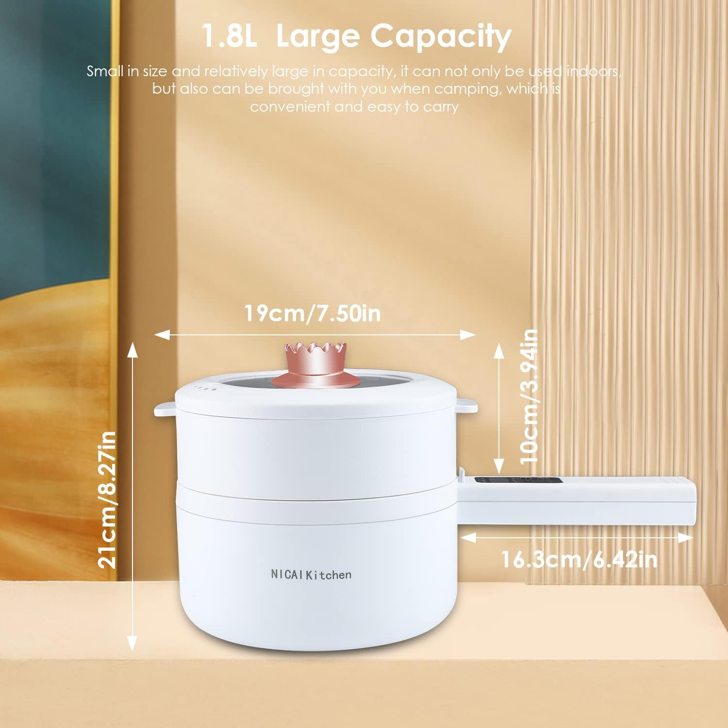 • 🥘【Portable&Easy to storage】 1.8L electric cooker has a mini size for easy to store and portable, suitable for 1-3 people,without handle: 2.6x7.7in,handle 5.8in.The electric pot is suitable for small rooms without kitchens such as studios, offices, and dormitories, which help you to store. It is suitable for you when traveling and picnics with your family or friends.