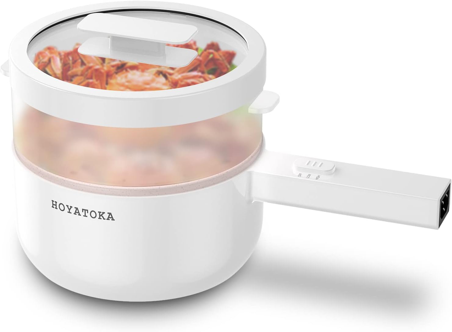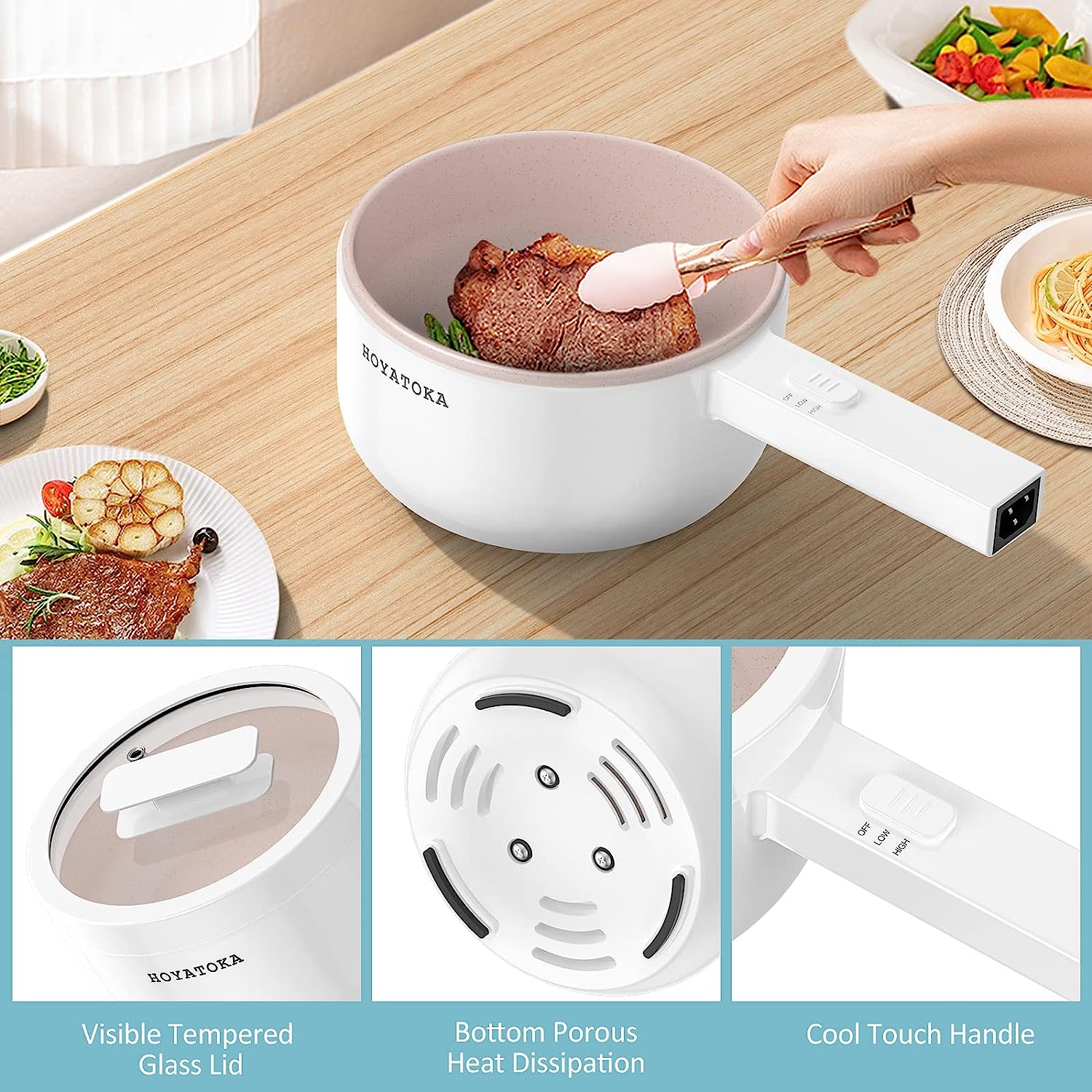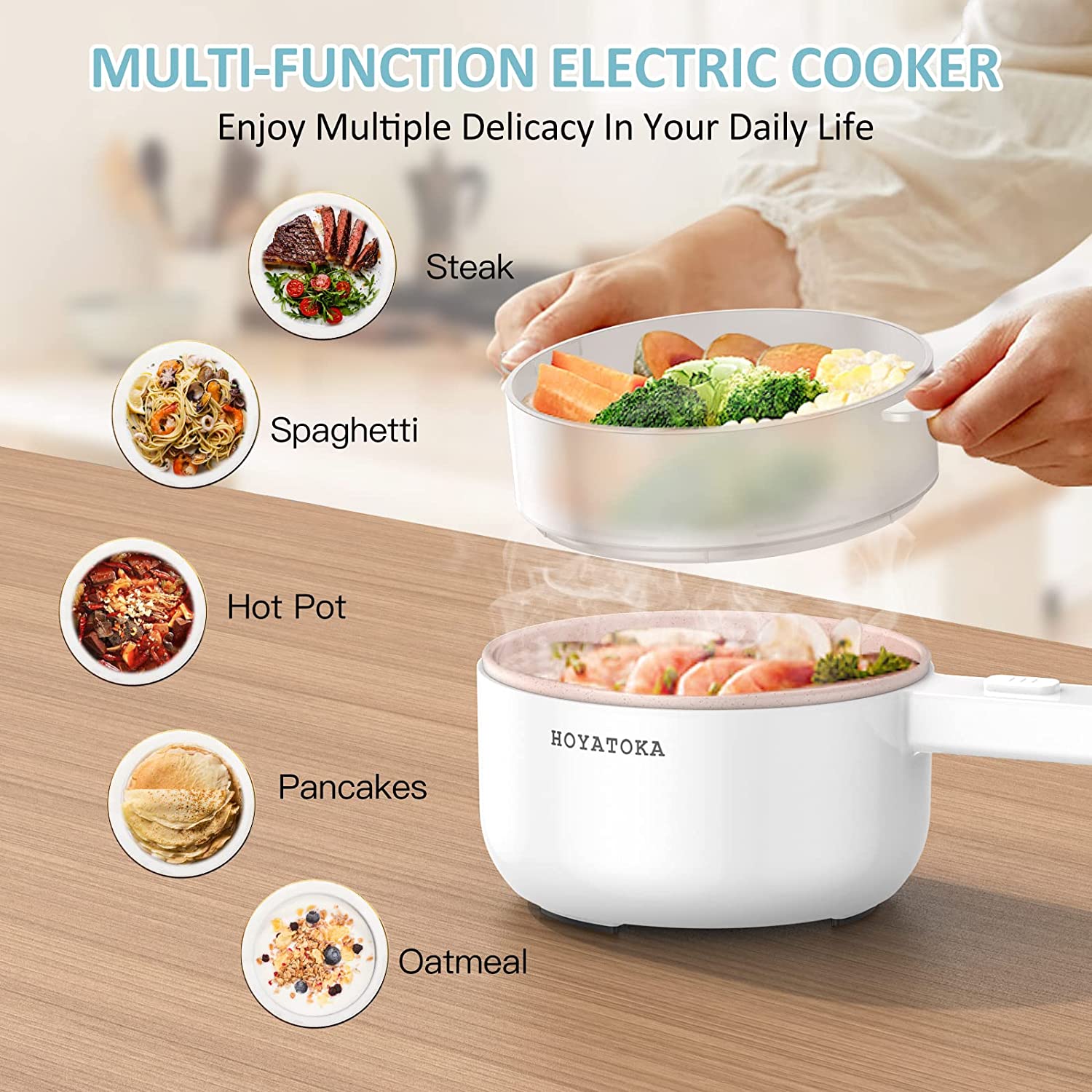 Hoyatoka Electric Hot Pot, 1.5L Portable Non-Stick Electric Cooker with Steamer, Multifunction Electric Pot for Stir Fry, Roast, Egg, Ramen Cooker with Dual Power Control for Dorm and Office, White
