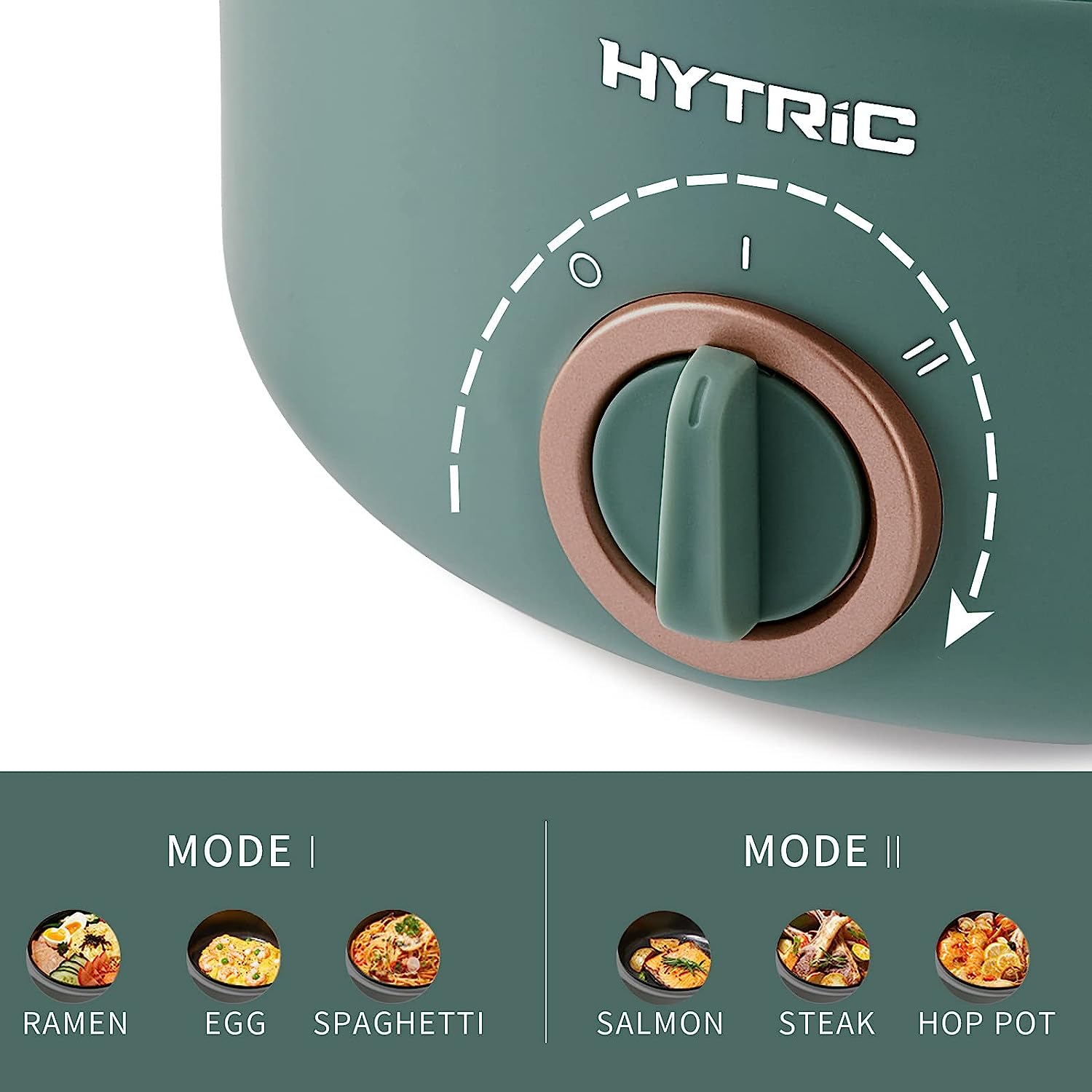 • Adjustable Power Control - Hytric electric frying pan has dual adjustable modes, easy to control your cooking or warming of food by rotating the power knob. The low-power mode(300W) for cooking ramen, scrambled eggs, pancake. Meanwhile, you can cook spaghetti, steak, salmon, sauté with the high-power mode(600W).