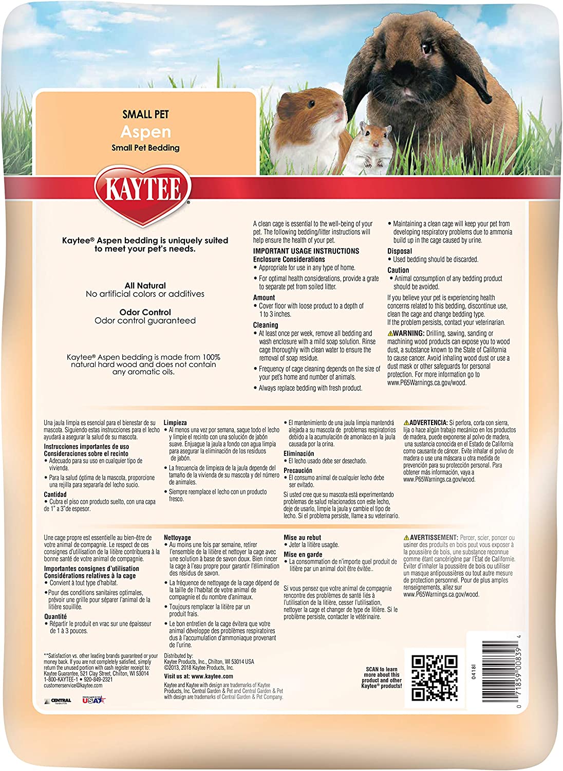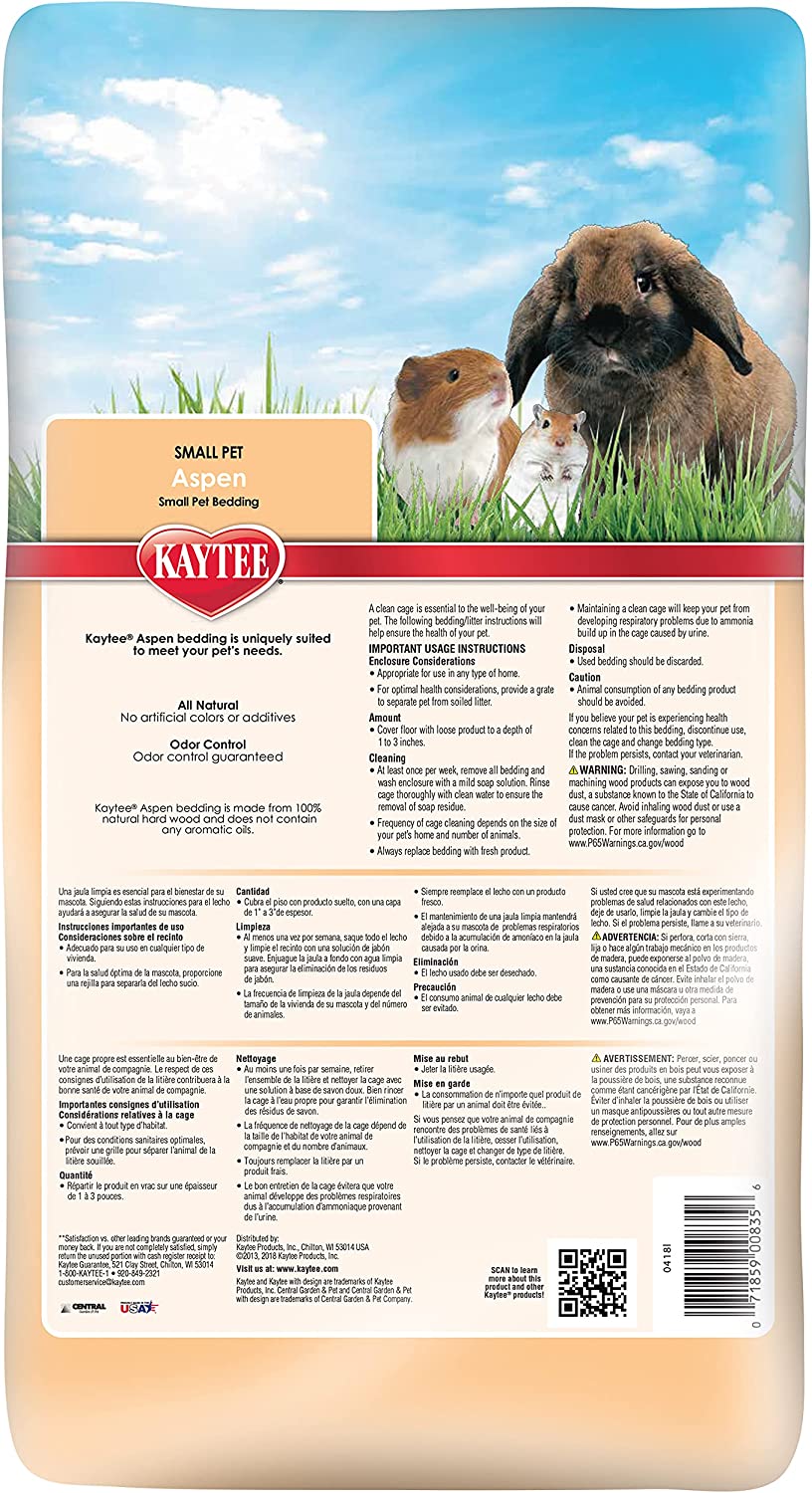 Kaytee Aspen Bedding and Litter is manufactured with all natural aspen shavings specially processed to eliminate dust and wood debris found in other bedding.