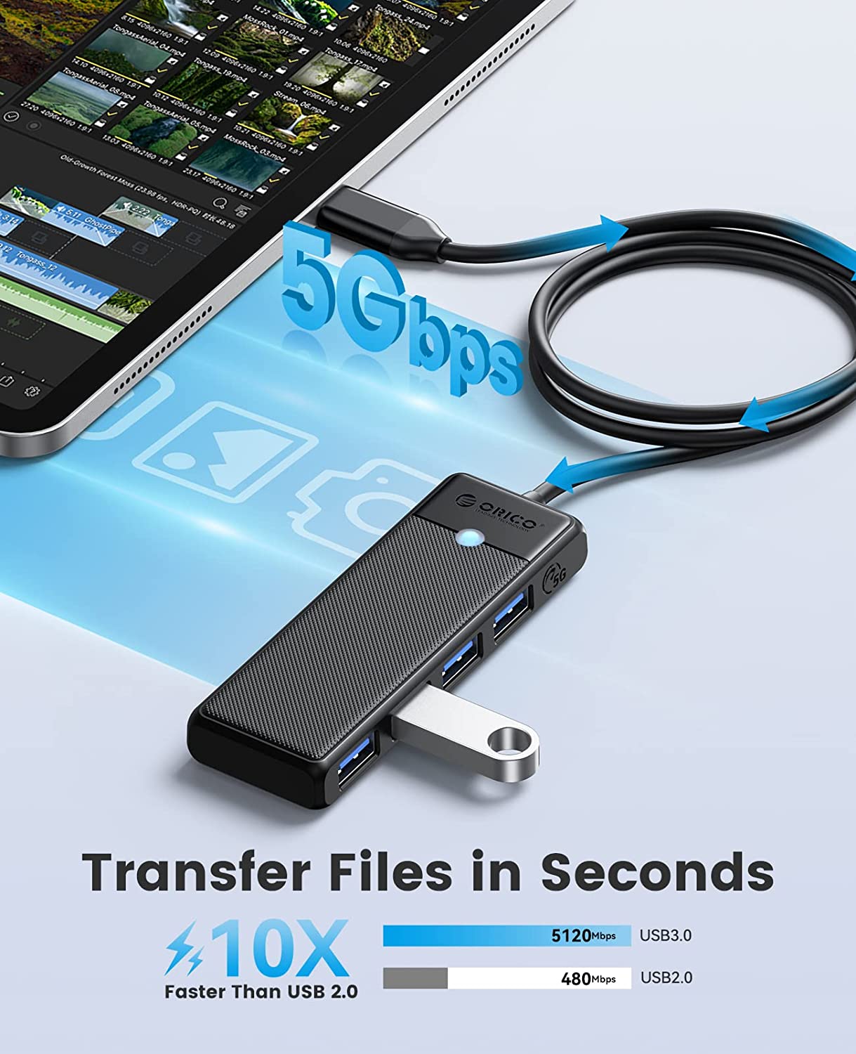 USB 3.0 Hub, ORICO 4-Port USB Hub, Ultra Slim USB Splitter for Laptop for MacBook, Mac Pro, iMac, Surface Pro,XPS, PS5, PC, Flash Drive, Mobile HDD(Black/0.5ft)
