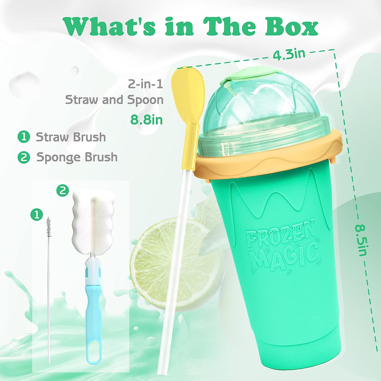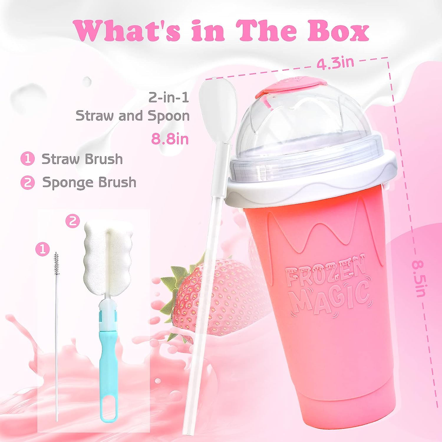 • [Whole-heartedly] We thoughtfully equipped the frozen magic squeeze cup with a straw brush and a cup brush, so you don't need to worry about cleaning. Note: Do not machine wash.